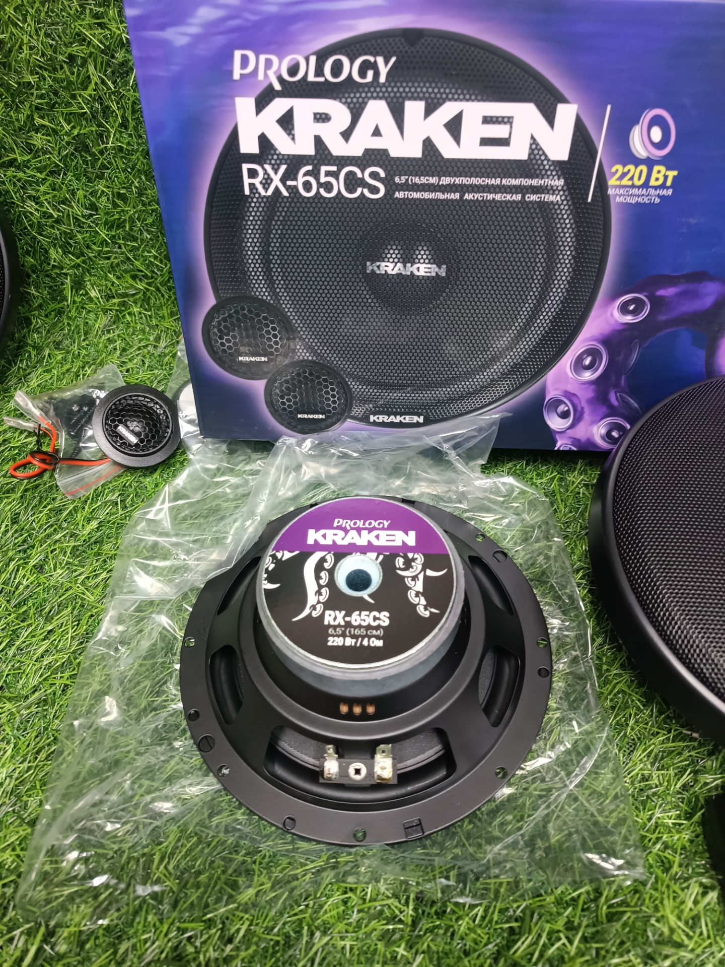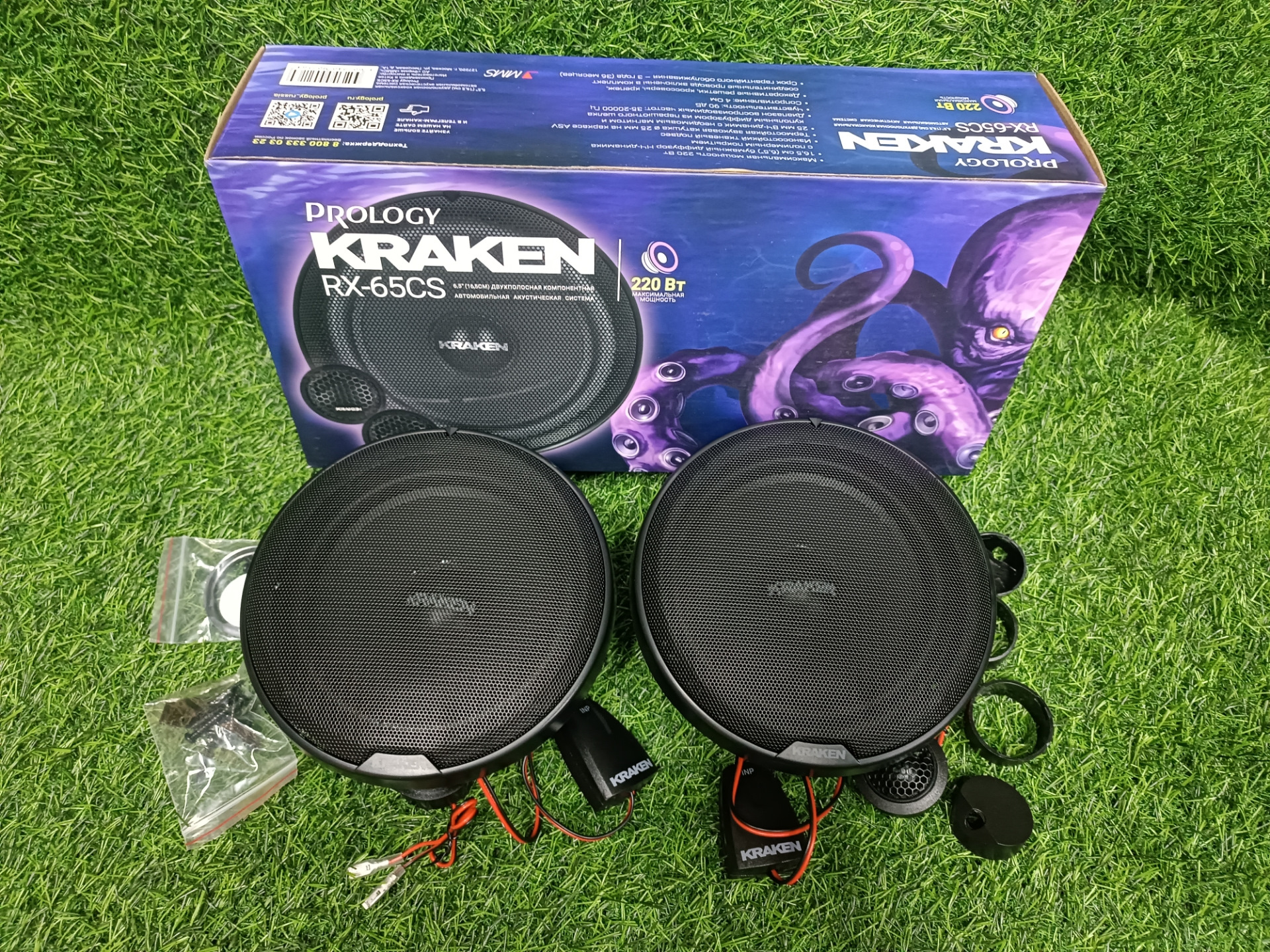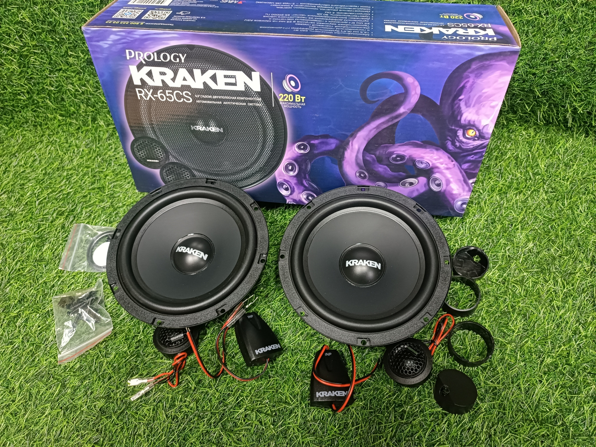 Низкочастотные динамики с декоративными решетками, кроссоверы и высокочастотные динамики в комплекте с проводами и крепежом достаточным для самостоятельной установки в автомобиль.