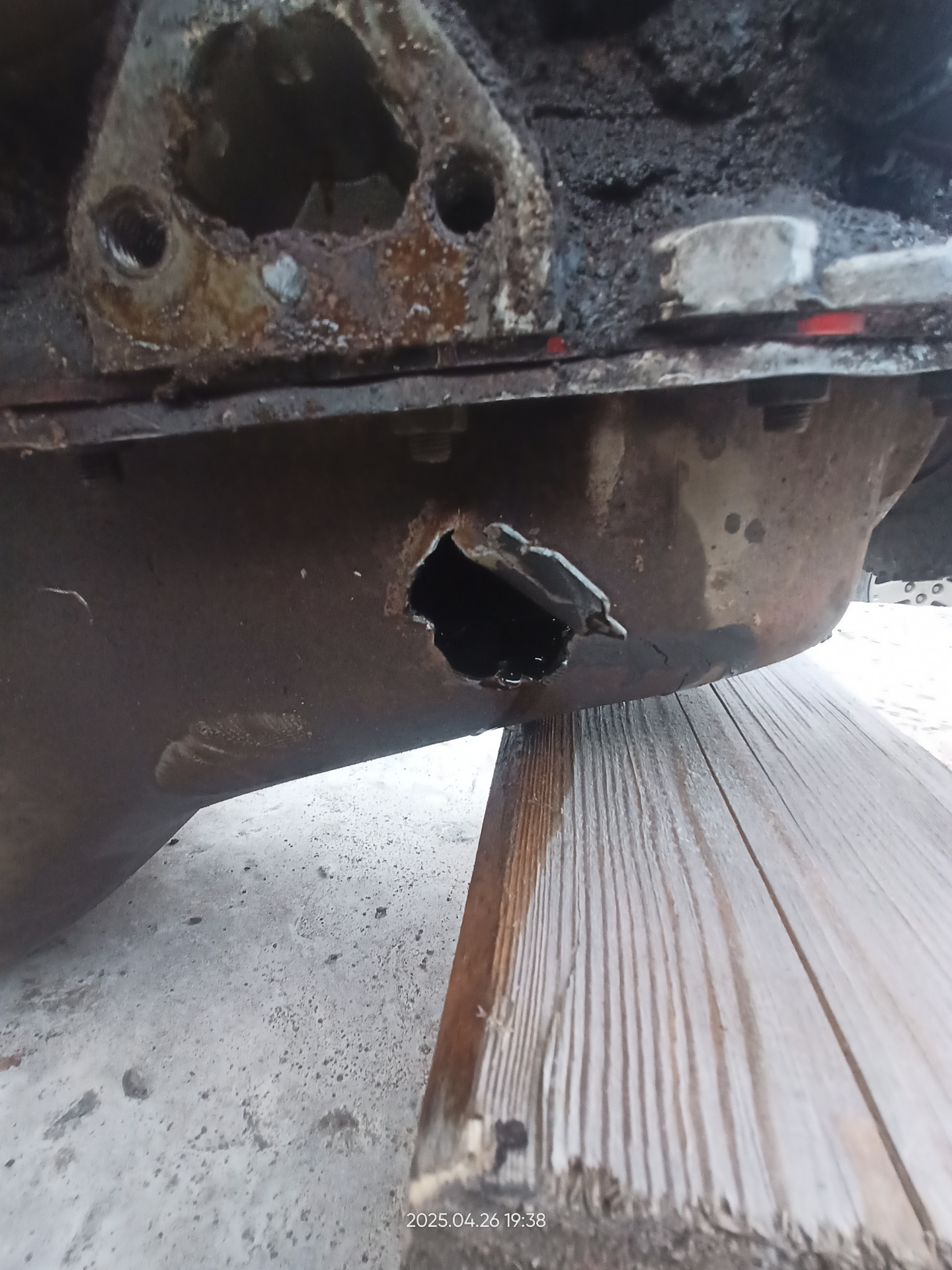 Выехали в 2 часа ночи от дома, проехал 800м, случился удар и непонятная работа двигателя. Сразу заглушил. Открыл капот и очень сильно огорчился увиденному: дыра с кулак в блоке слева у первого цилиндра, шатун торчит, говорит привет! Выйдя из машины в 10 метрах позади нашел вторую часть шатуна.