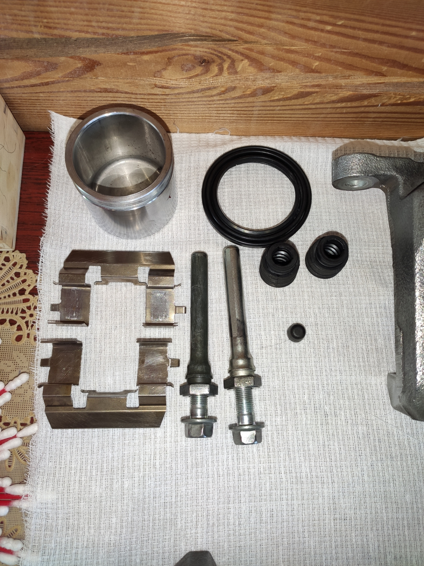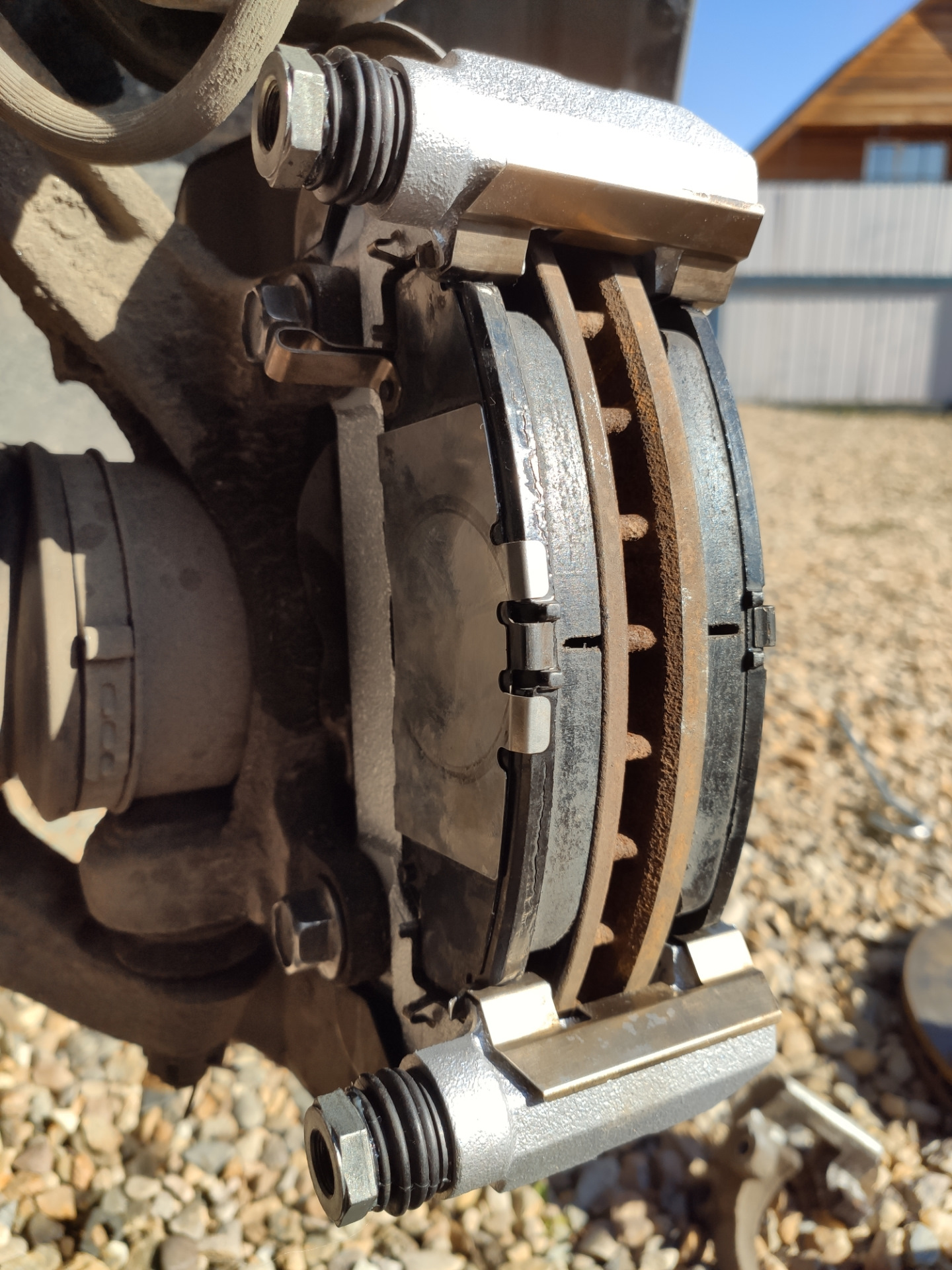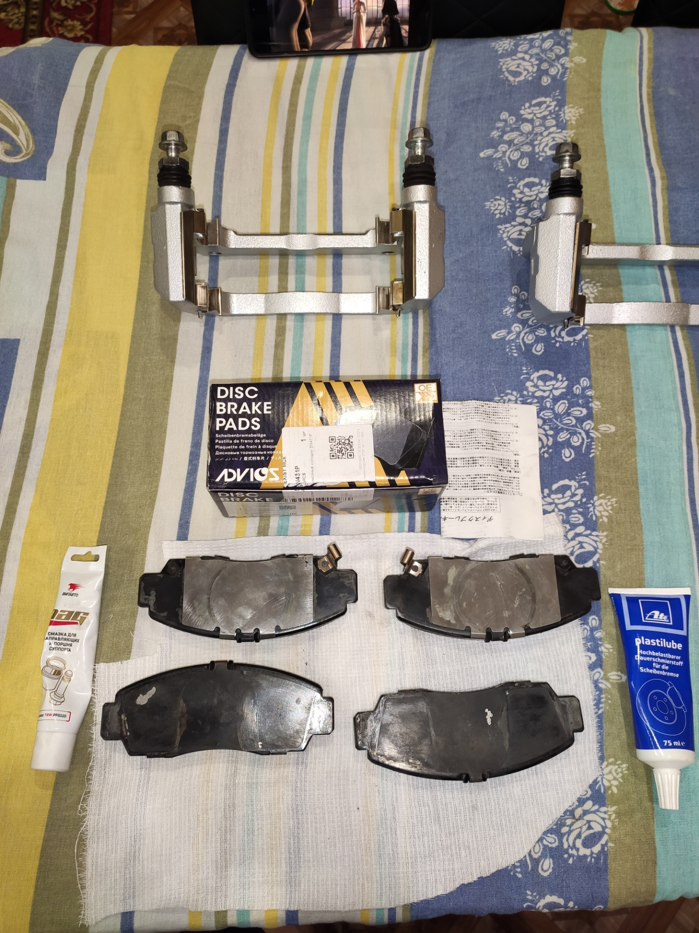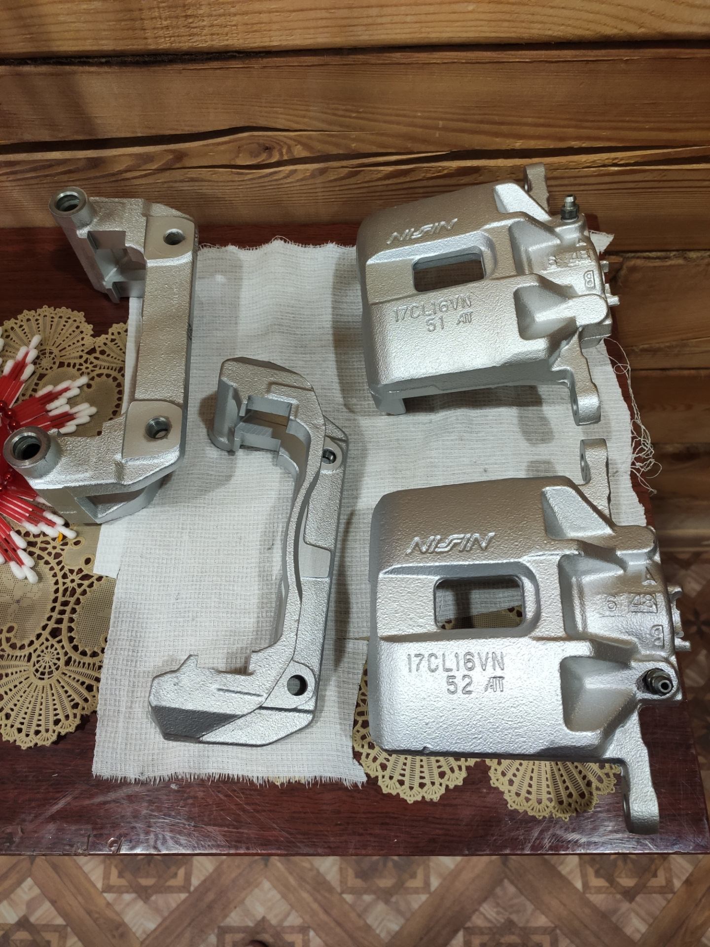 Суппорта полностью разобрал, промыл все резинки и обновил смазку. Пока всё было разобрано, то и покрасил высоко температурной краской. Так как с суппортами были ещё и колодки и на них противоскрипные пластины, то переставил их на новые колодки. Самое трудное при сборке суппорта это была установка цилиндра и надевания на него пыльника, но с помощью пластикового крючка и трёх стяжек, и двух пар рук получилось это сделать😁😁.