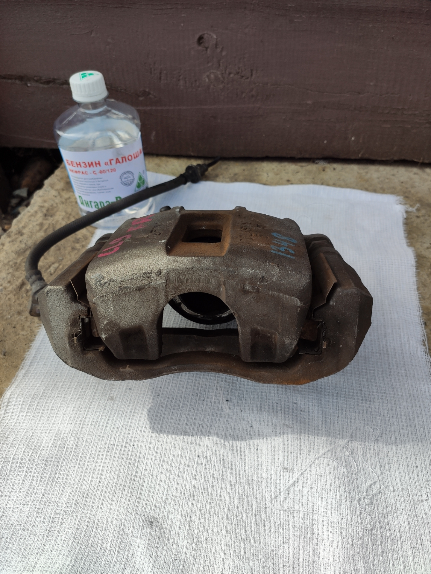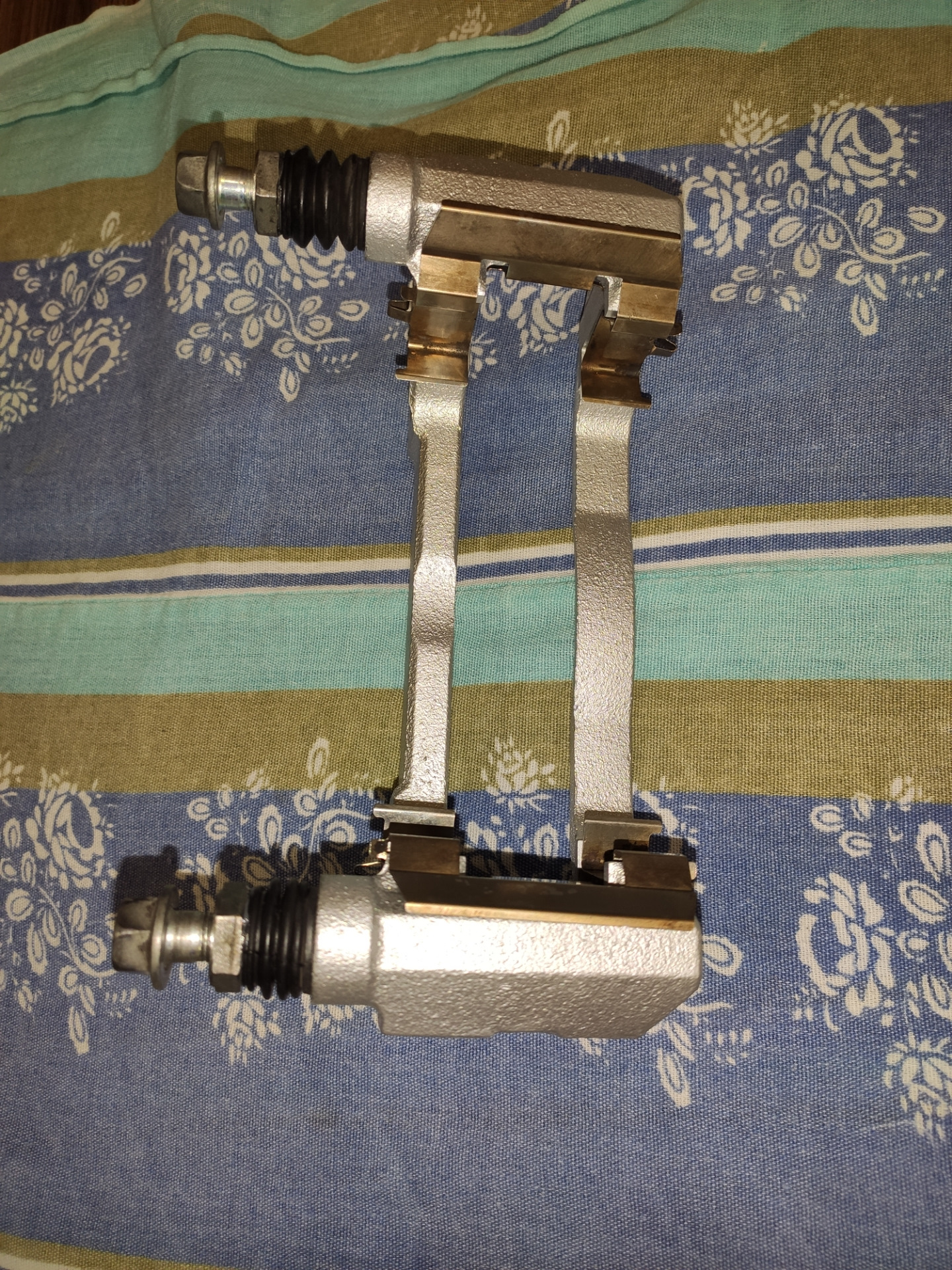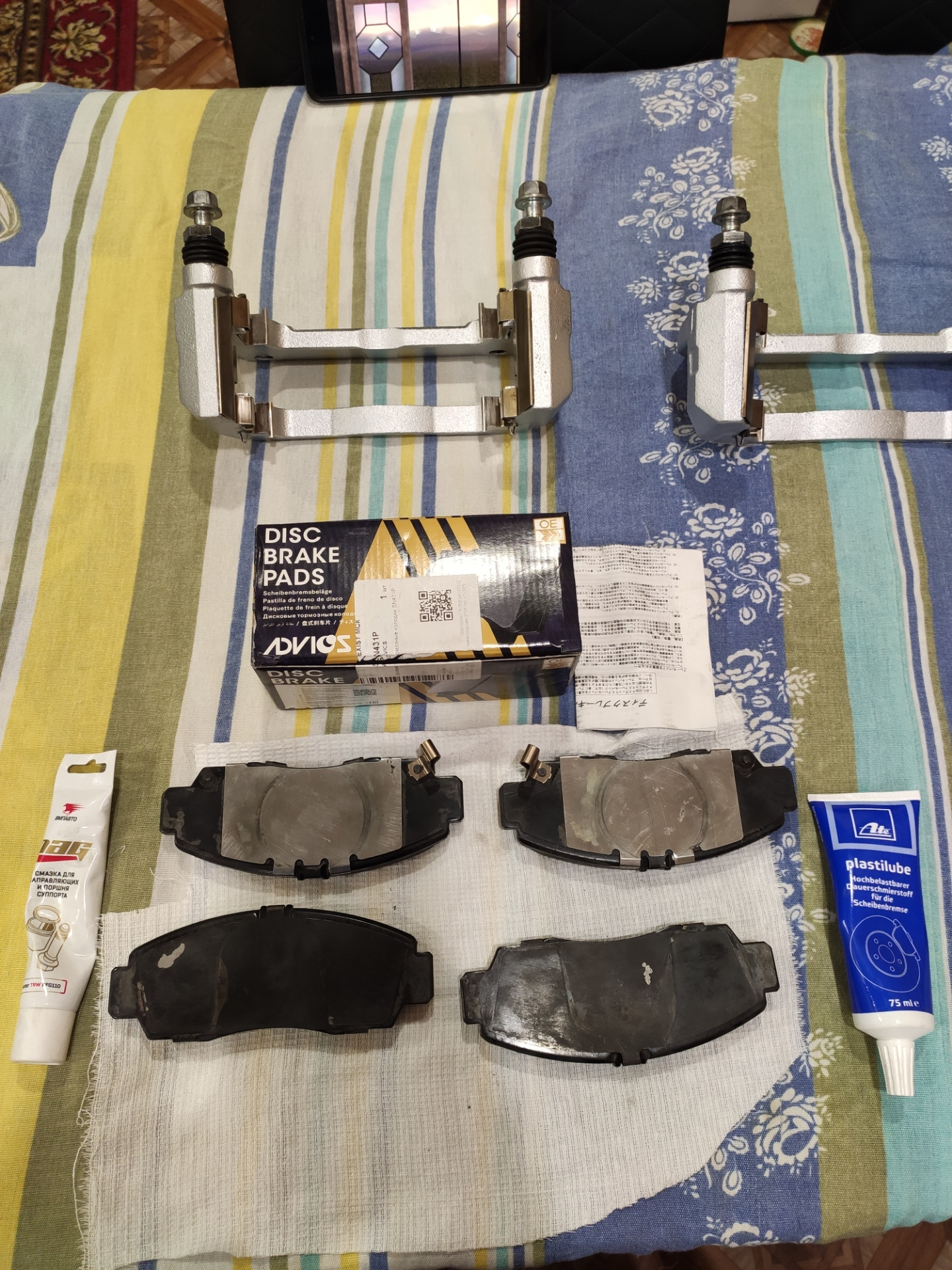 Суппорта полностью разобрал, промыл все резинки и обновил смазку. Пока всё было разобрано, то и покрасил высоко температурной краской. Так как с суппортами были ещё и колодки и на них противоскрипные пластины, то переставил их на новые колодки. Самое трудное при сборке суппорта это была установка цилиндра и надевания на него пыльника, но с помощью пластикового крючка и трёх стяжек, и двух пар рук получилось это сделать😁😁.