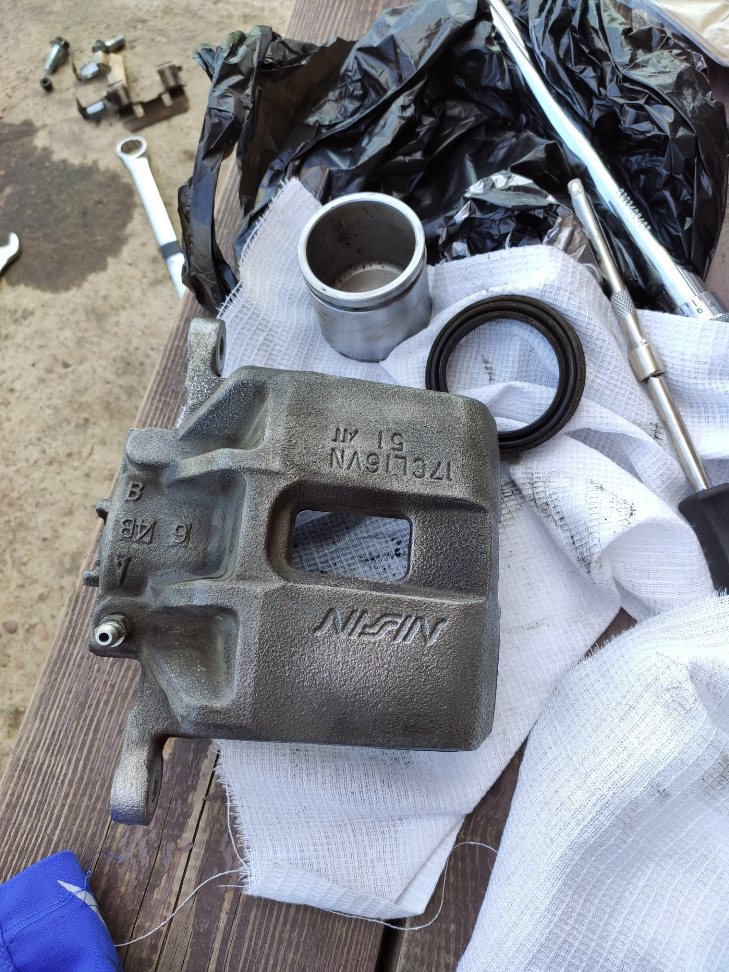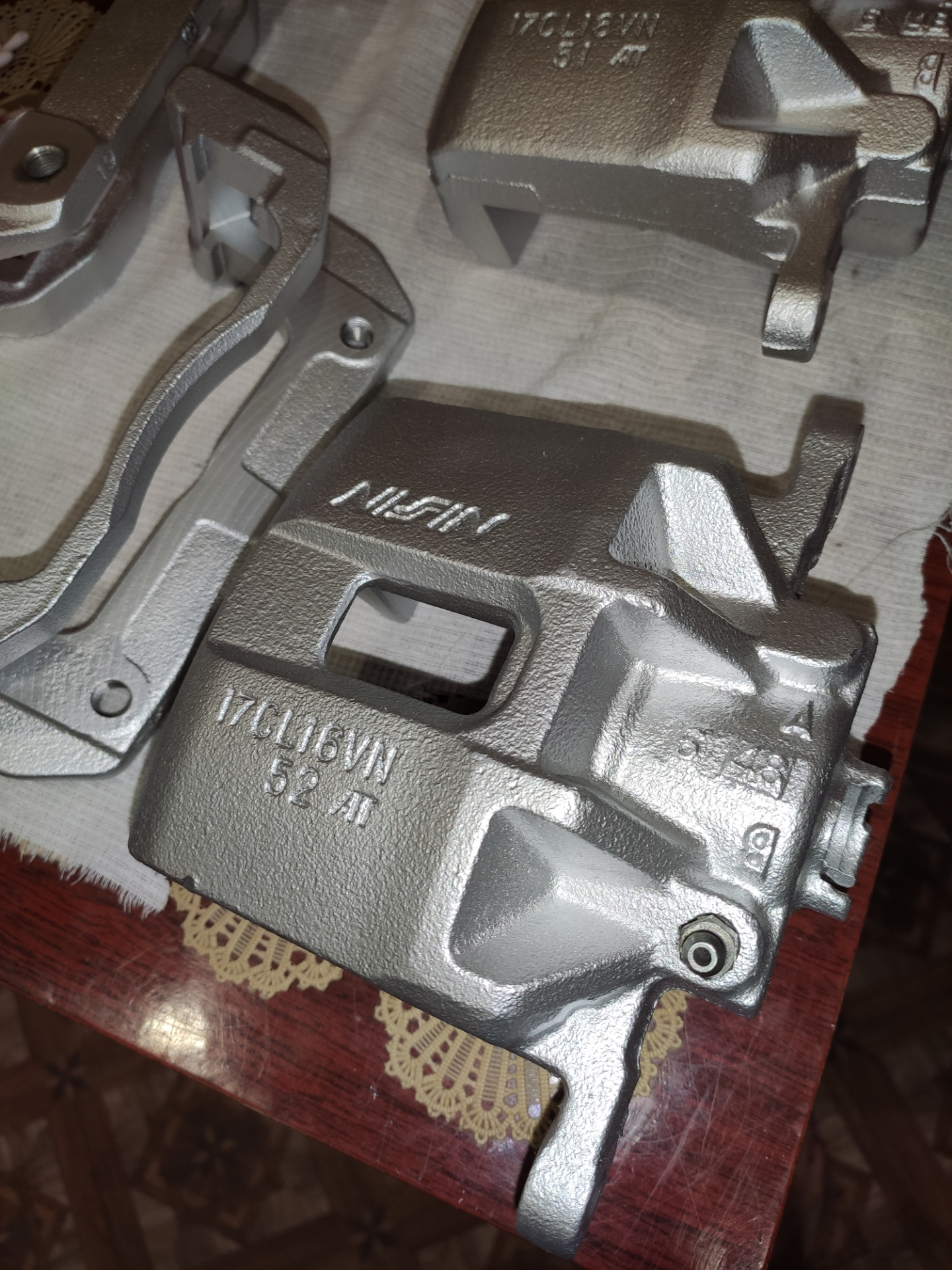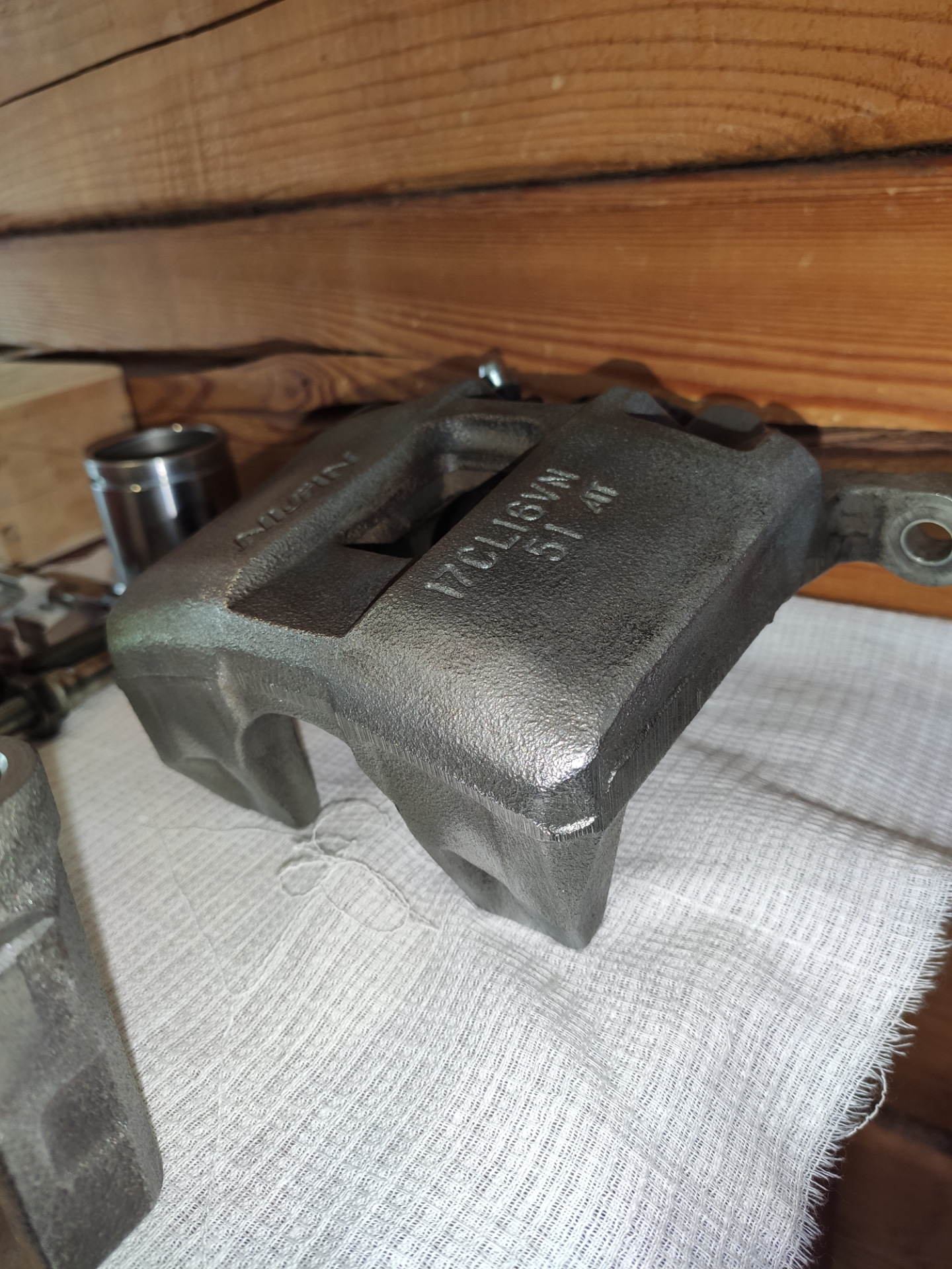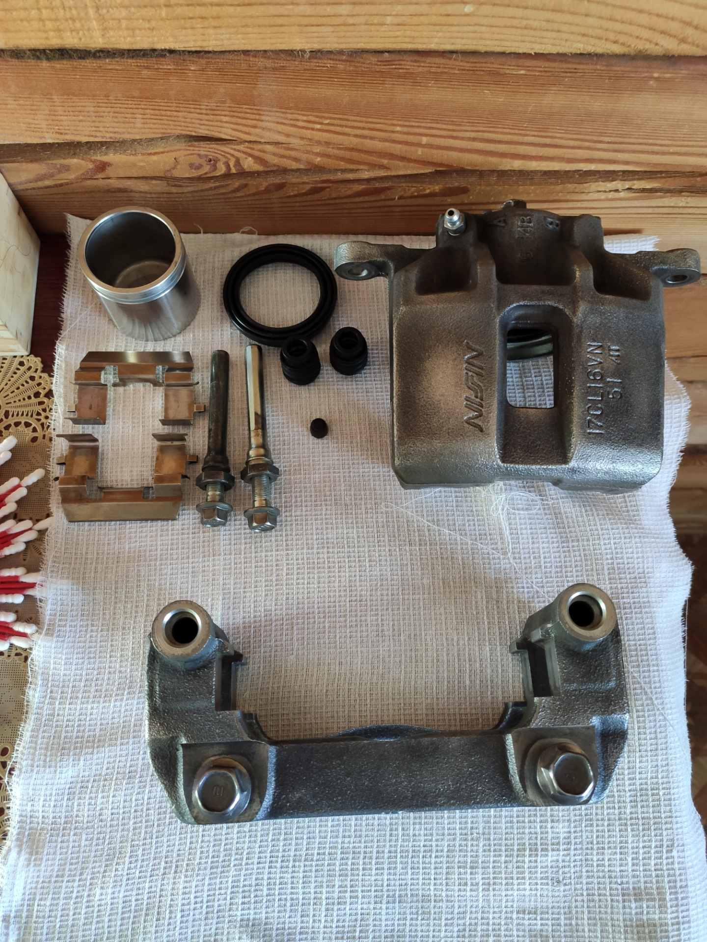 Суппорта полностью разобрал, промыл все резинки и обновил смазку. Пока всё было разобрано, то и покрасил высоко температурной краской. Так как с суппортами были ещё и колодки и на них противоскрипные пластины, то переставил их на новые колодки. Самое трудное при сборке суппорта это была установка цилиндра и надевания на него пыльника, но с помощью пластикового крючка и трёх стяжек, и двух пар рук получилось это сделать😁😁.