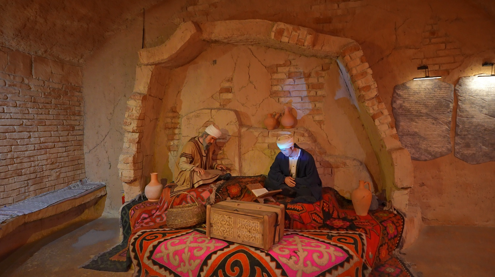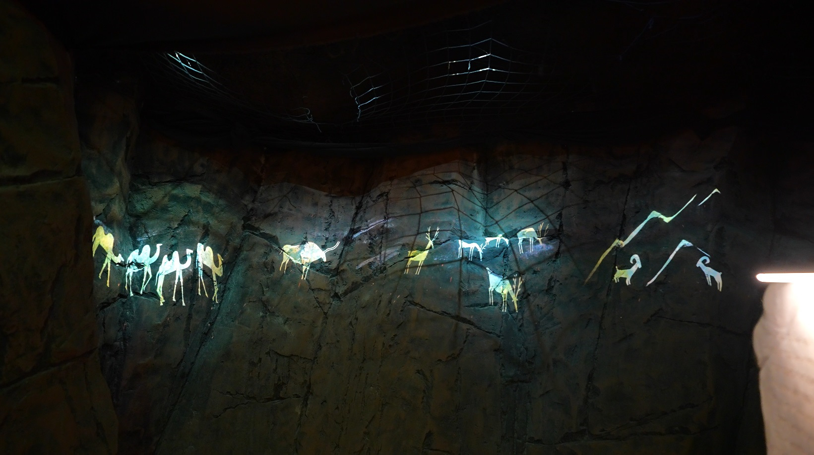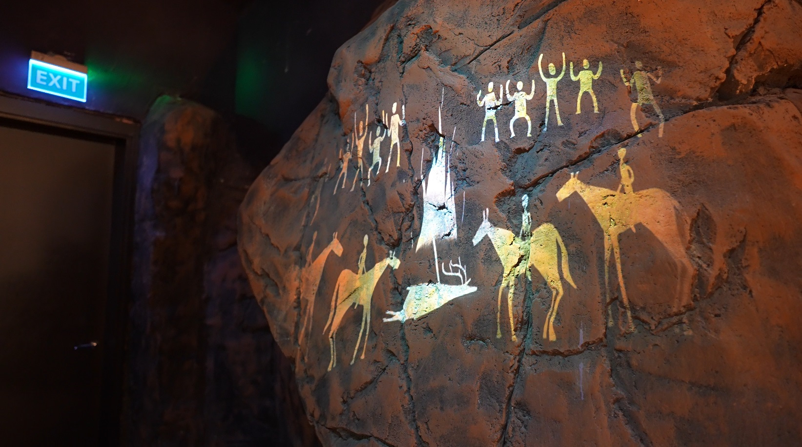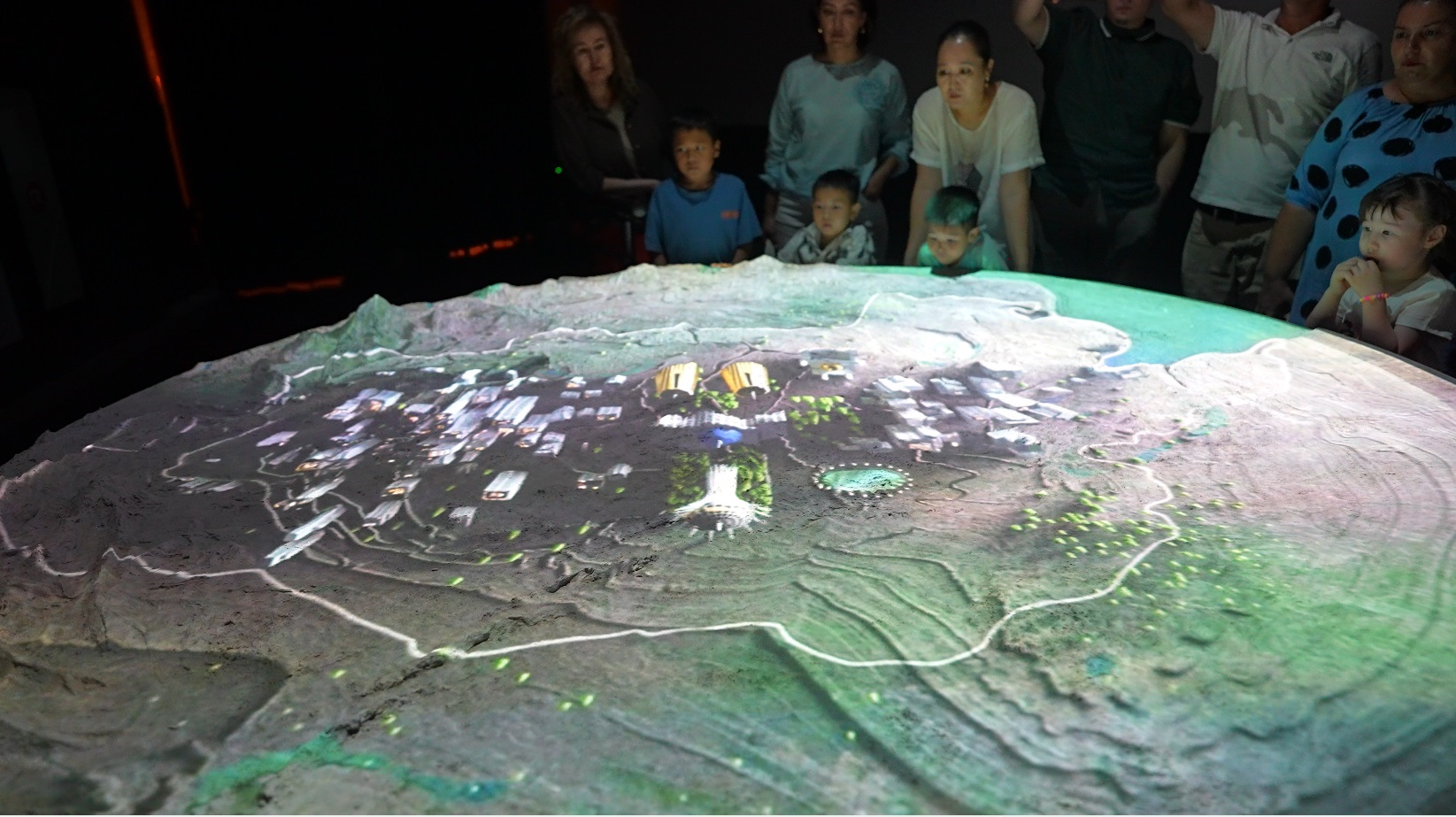 Сначала вас ведут по импровизированной пещере, где на ее стенах проецируются анимированные наскальные рисунки, экспозиции с казахским бытом, разговаривающих старцев, и в конце концов большая круглая анимированная карта истории Казахстана.