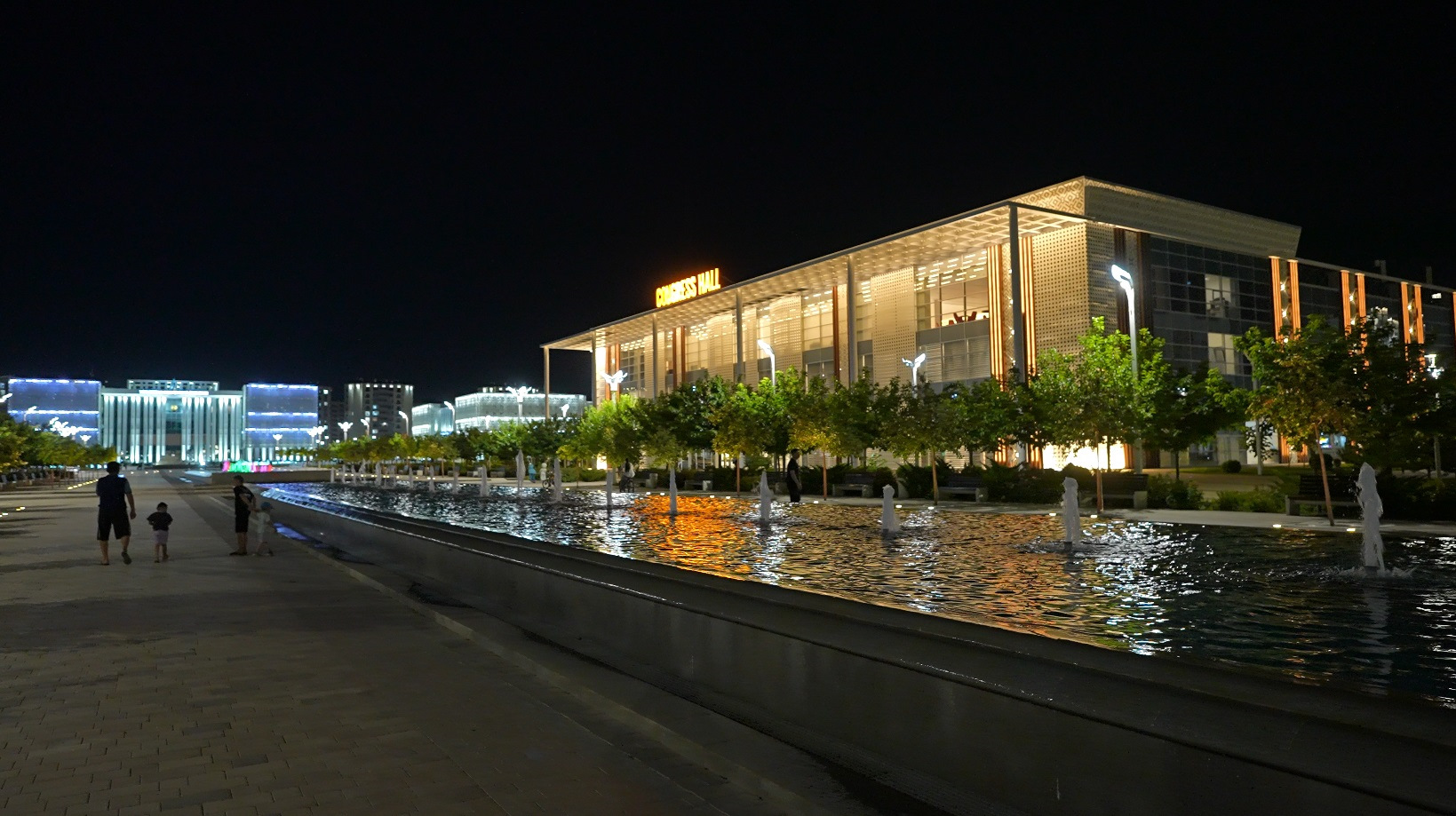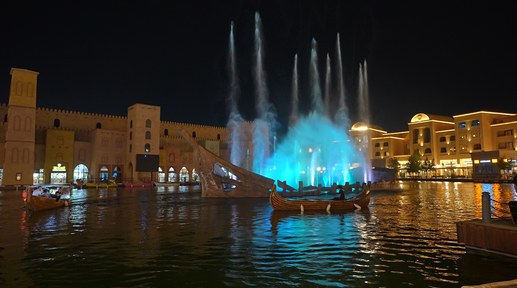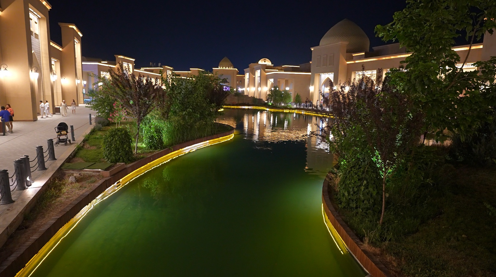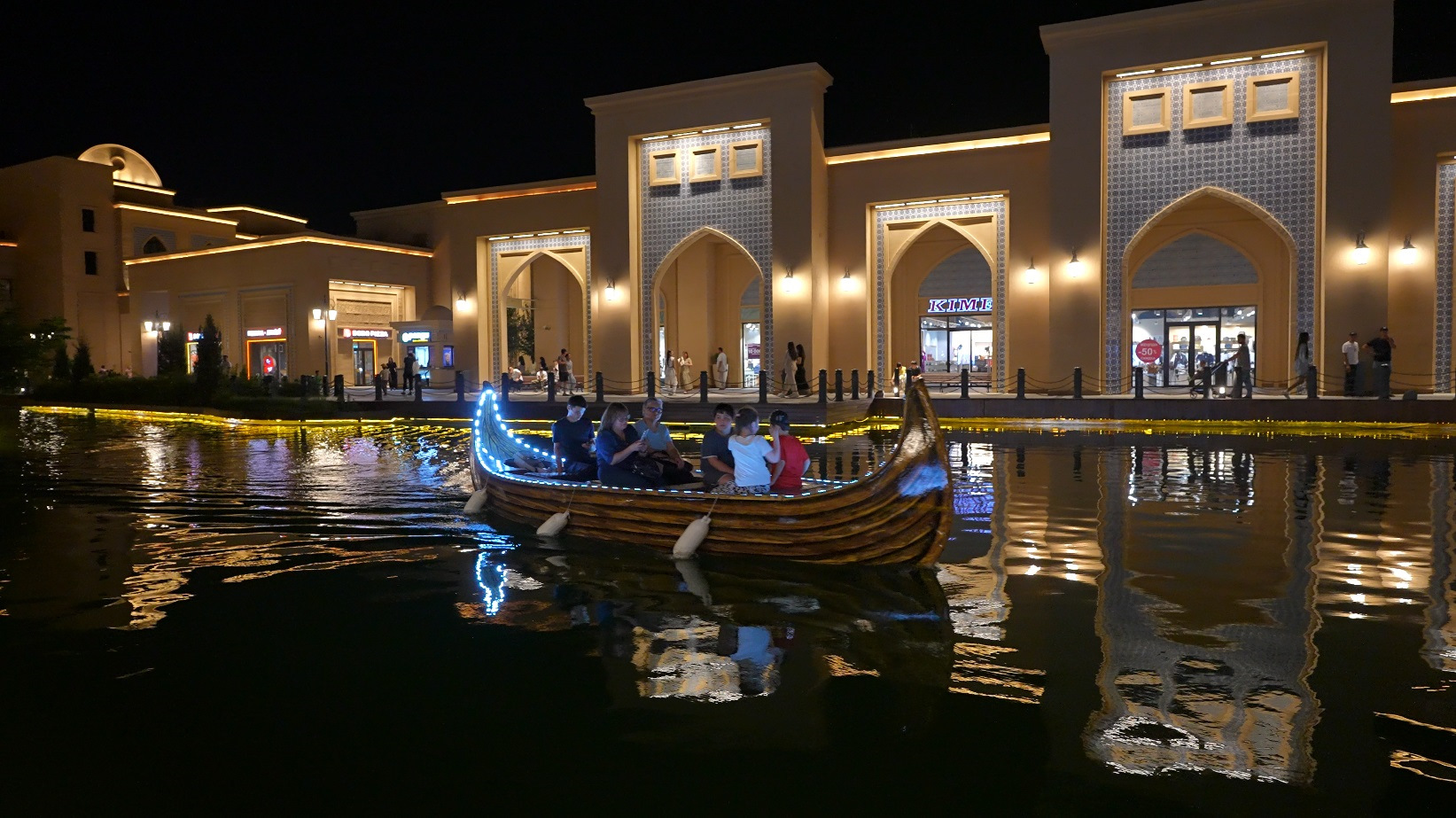 К вечеру с детьми мы запланировали прогулку на лодке по водному каналу, приехали специально когда все стемнело. Архитектурная подсветка выгодно отделила зрелищность комплекса от дневного посещения. Вода в канале как будто зеленоватая.