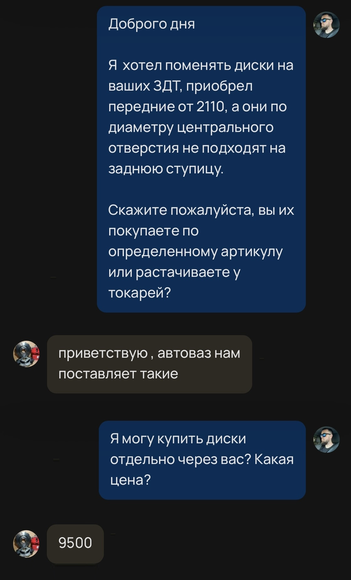 Мало того что он нагло пиз звездит про поставки не стандартных дисков якобы напрямую с АвтоВАЗа, так ещё и цену лупит как за условные "BREMBO". Ну что тут сказать? Бог ему судья.