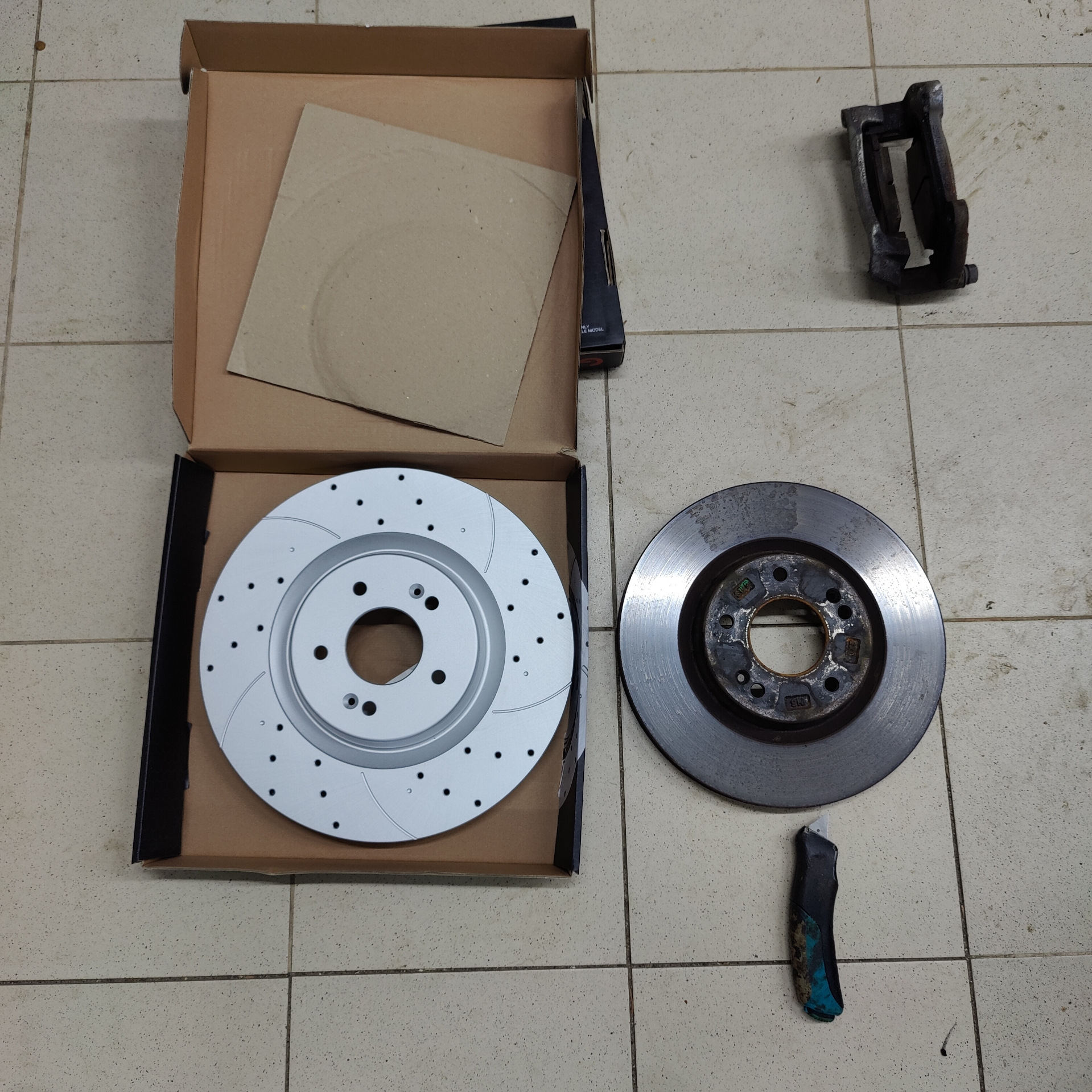 Едем дальше. Нюанс: колодки новые+ более толстые диски образуют такую толщину, что суппорт не надевается, надо стачивать с каждой колодки по ~2мм (точные значения знает Антон, он уже поставил).