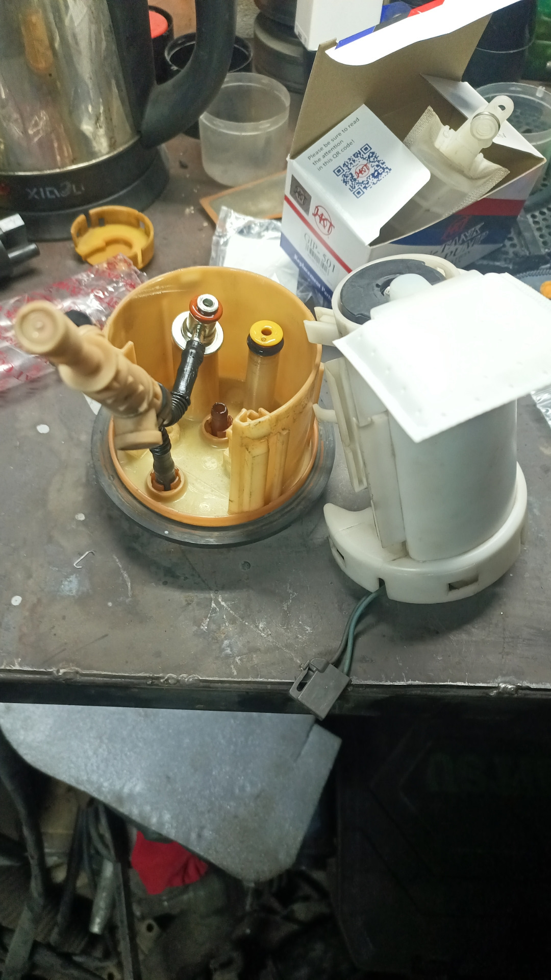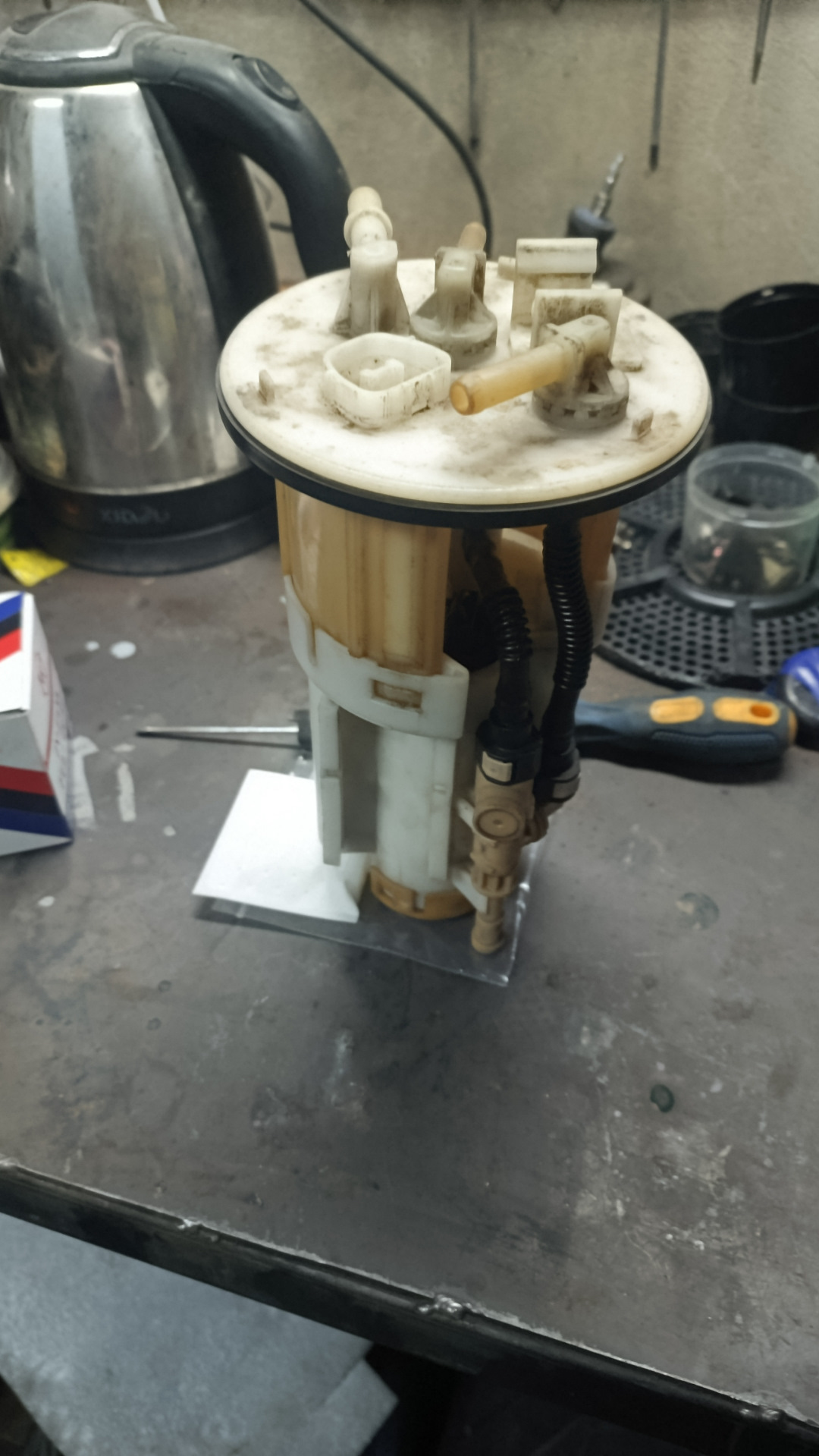 Бензонасос менять не планировал, к нему вопросов не было. Но дальше начались сюрпризы, а именно после сборки машина отказалась нормально работать — заводилась с трудом и глохла с разной периодичностью. Достал колбу еще раз довольно грязную, хотя до этого мыл сверху. Очень долго вымывал черноту из внутренней ее части. Поменял бензонасос на новый HKT GIP-501, но эффекта особого не дало.
