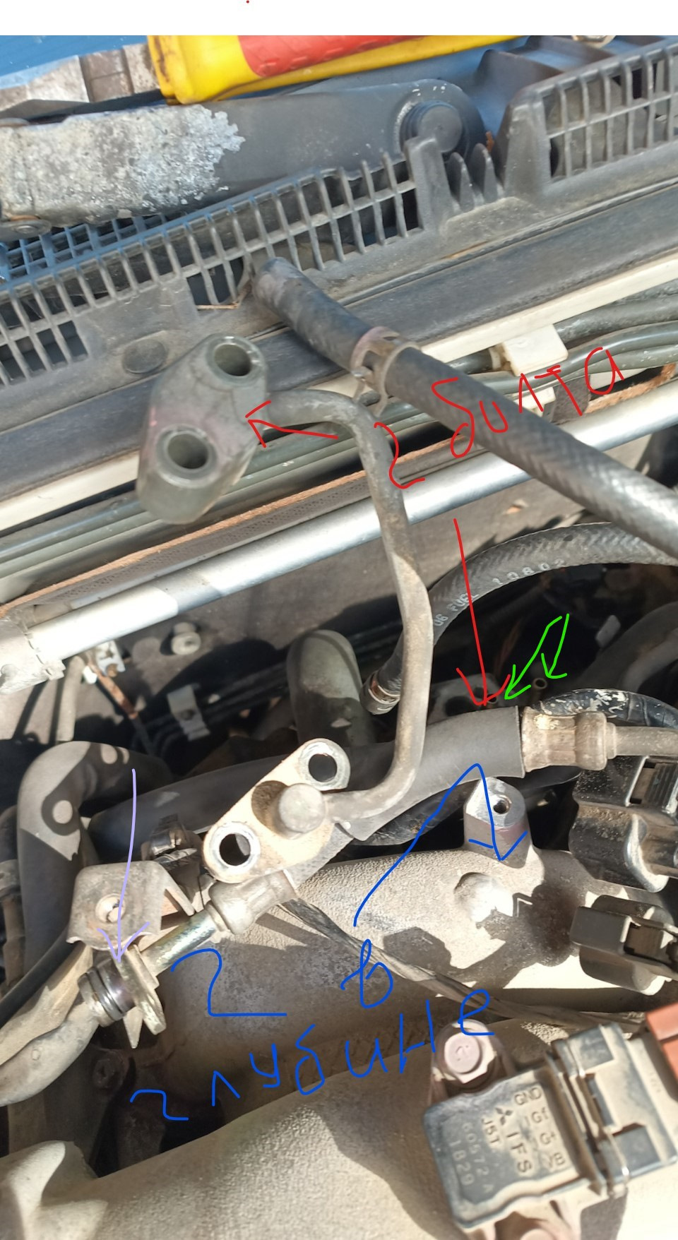 нет, все делал под капотом. 2 болта на 12 красных открутить не проблема. Труднее добраться к синим. Для этого снимаем 2 зеленых шланга обратки с зажимными хомутами и еще один фиолетовый шланг с болтами на 10. Далее берем удлинитель с головкой на 12 и добираемся вглубь. Вот их открутить сложнее но все же реально. Потом пошатывая трубку снимаем ее.