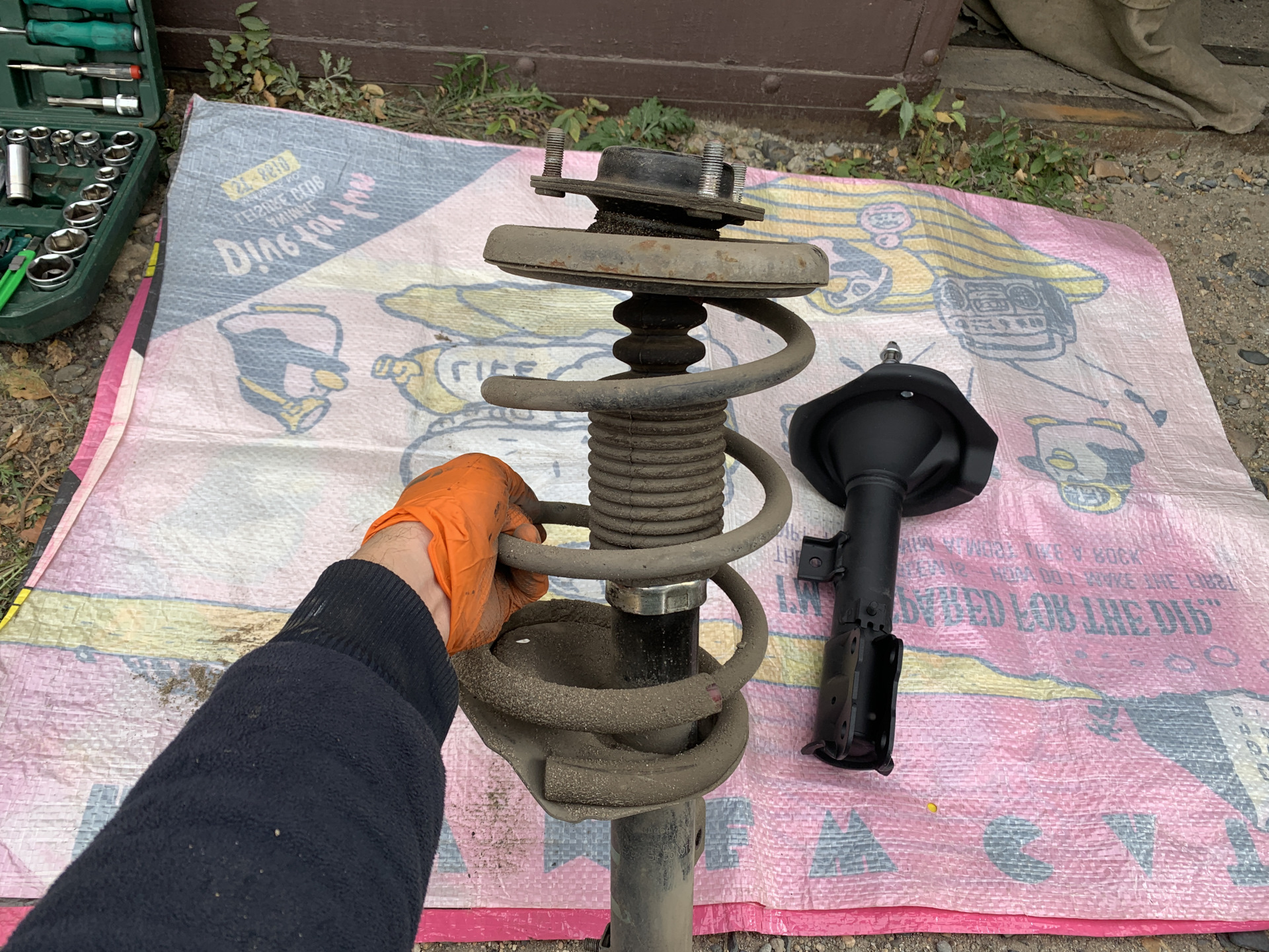 5. Берём стяжки для пружин. Здесь работает принцип «глаза боятся, а руки делают»: стягиваем пружину, разбираем старый амортизатор.