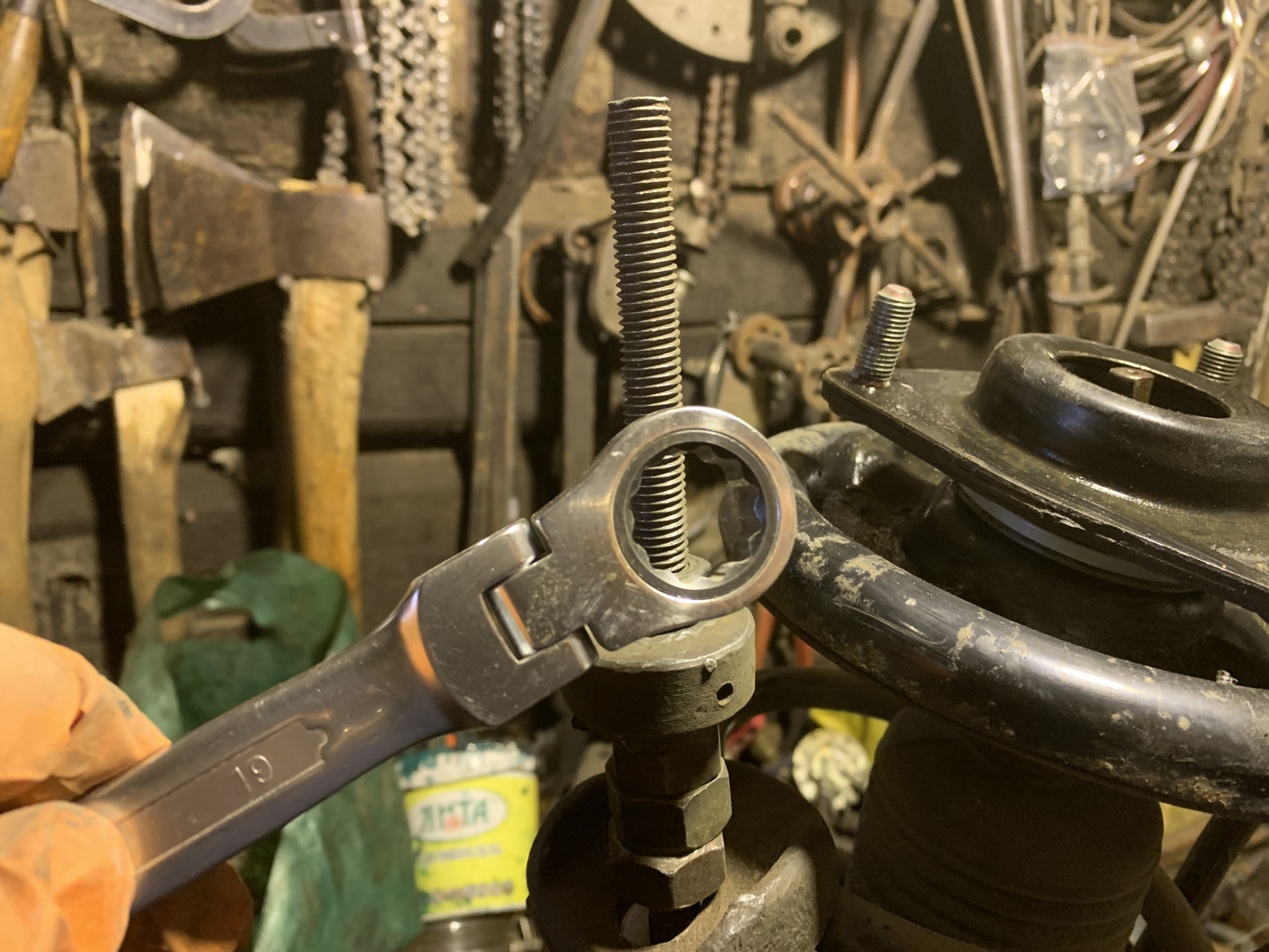 Очень удобно, что на передней подвеске есть приятное преимущество: можно сорвать гайку штока амортизатора, когда он еще под нагрузкой, и немного её ослабить. С задними такой фокус не прокатывает.