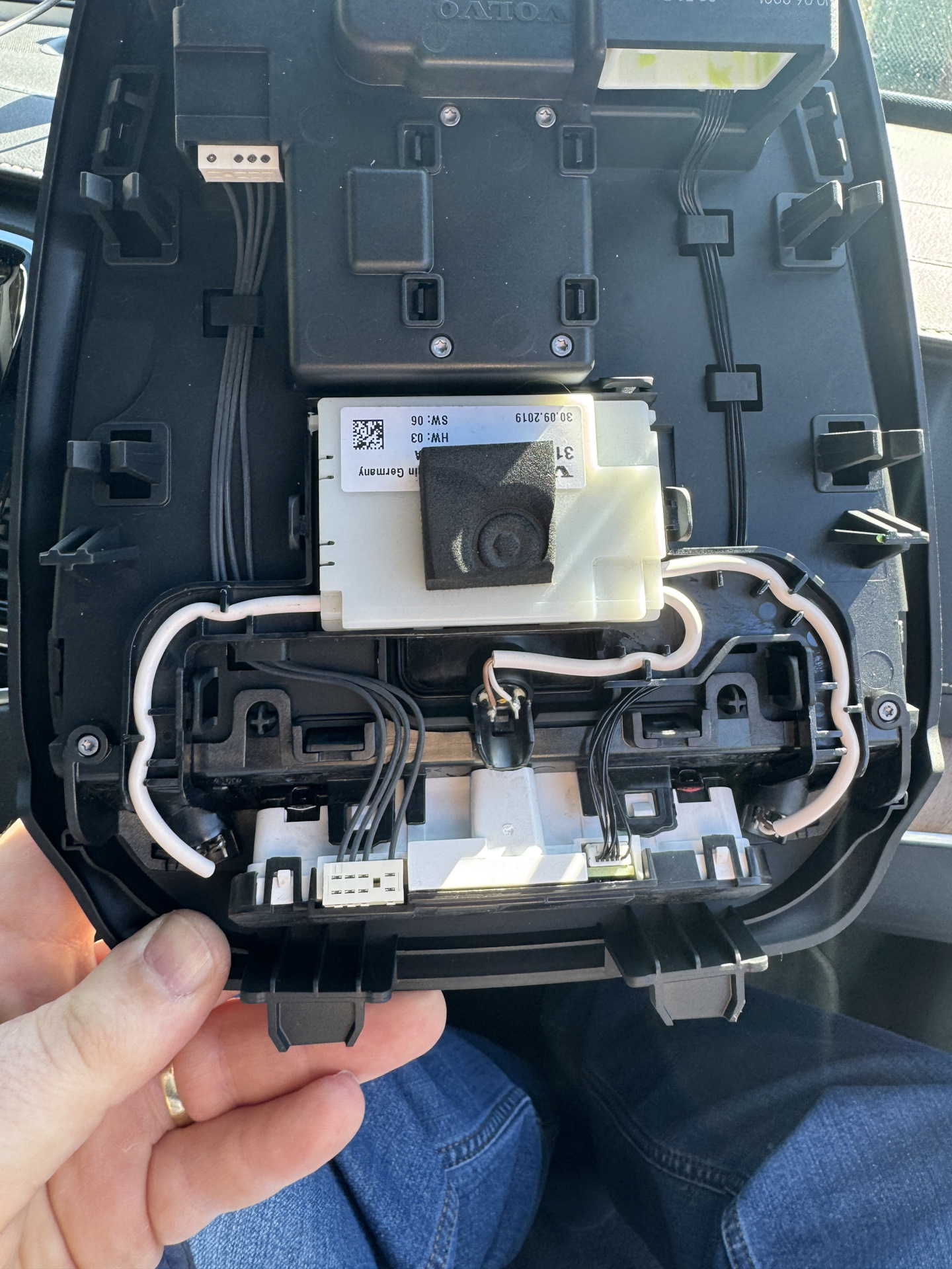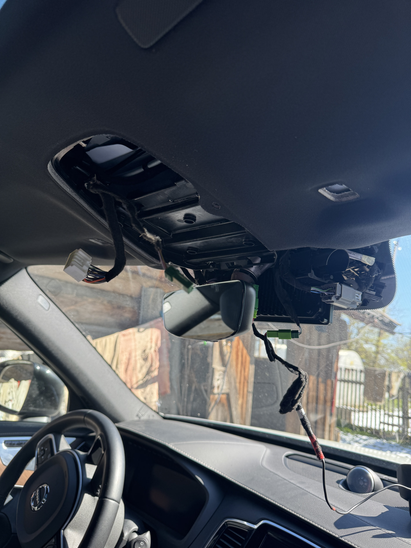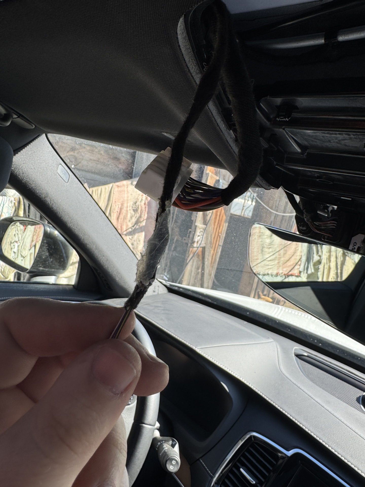 В салоне чуть сложнее. Нужный нам провод намертво приклеен с обратной стороны обшивки потолка в районе водительского места. Своими лапами я не смог туда залезть, просил жену.
