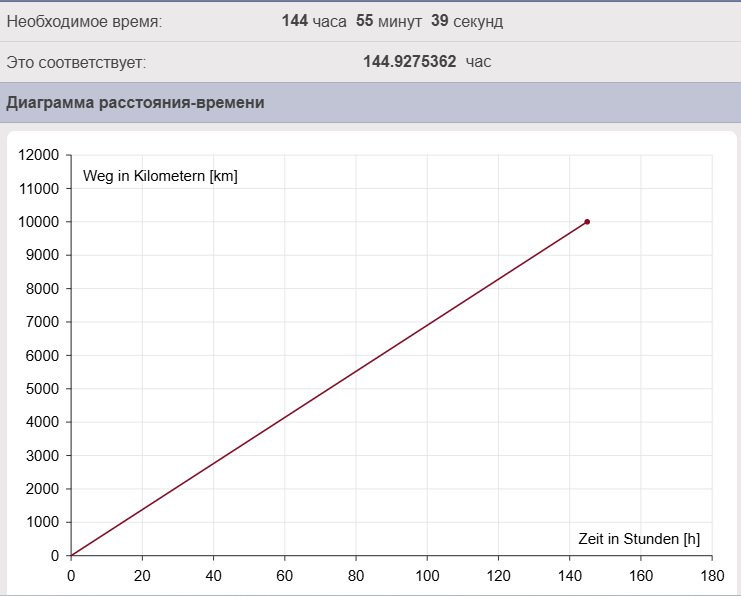 Часы берутся от средней скорости, у меня показывает 69 км средняя скорость, это 144 часа 55 минут на 10000 км.