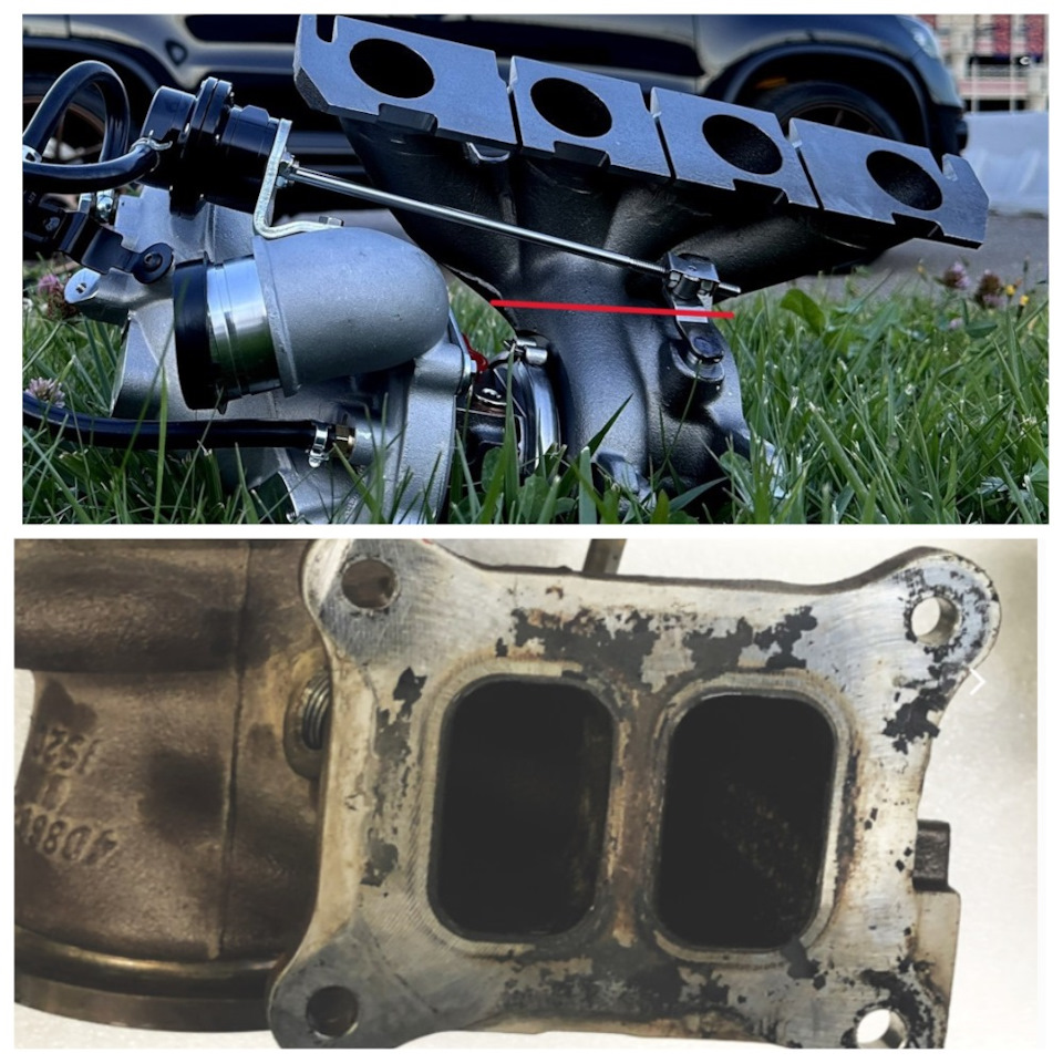 Выпускной коллектор интересно сделан, судя по форме там схема "4-2-турбина", если разрезать в месте где я провел красную линию мы увидим то, что на нижней картинке, т.е. выхлоп каждой пары цилиндров( 1-4 и 2-3) залетает в турбину по своему каналу, как на турбинах под Gen3/4(нижняя картинка) — это прям хорошо, правильный коллектор если так сделано. Штатный коллектор скорей всего по схеме "4-1-турбина" сделан.