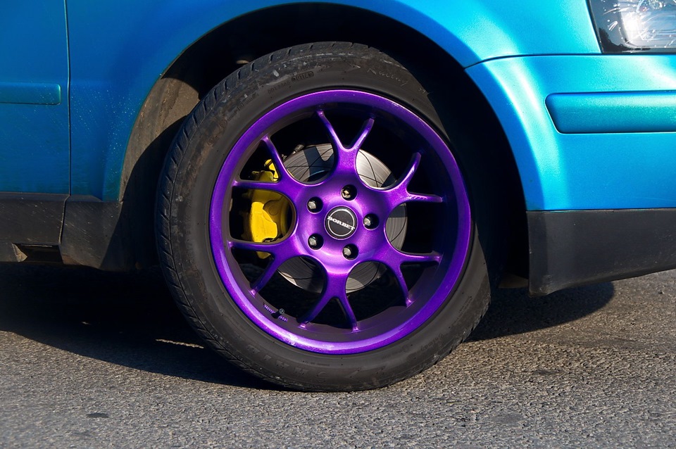 Цвет машины синий, колёса фиолетовые, суппорта жёлтые. Какая-то радуга