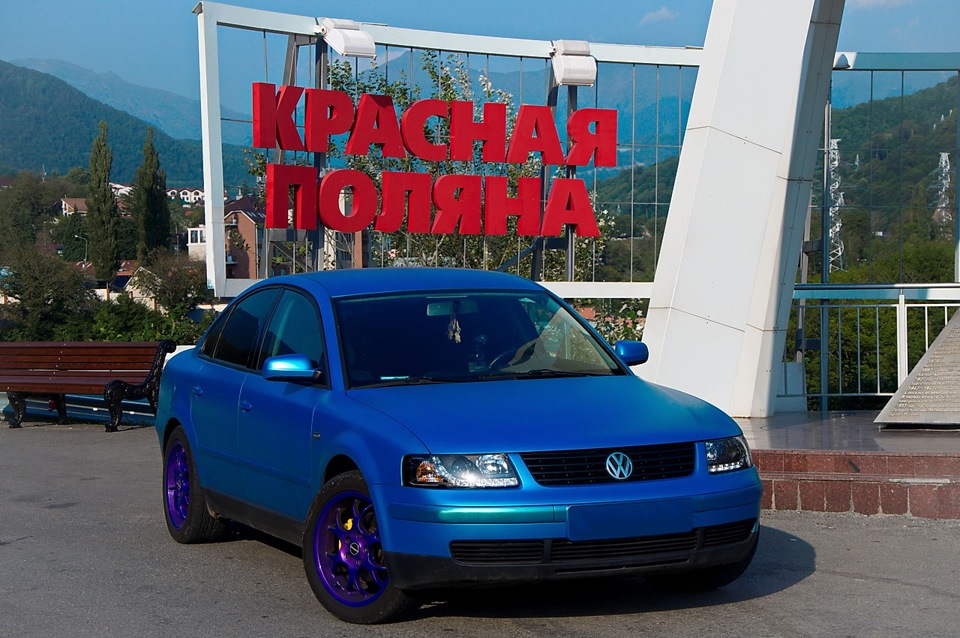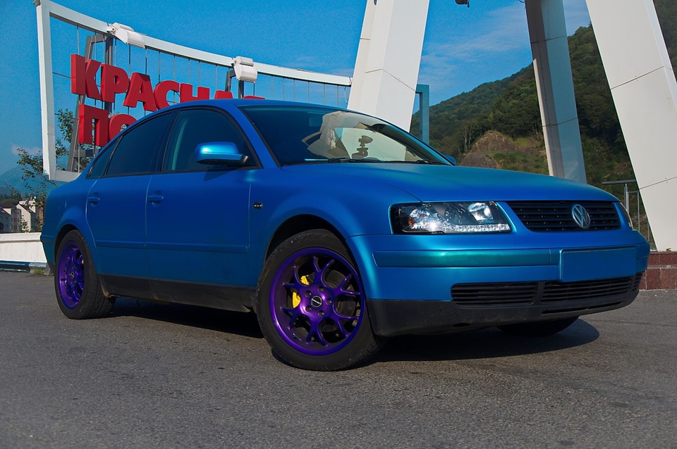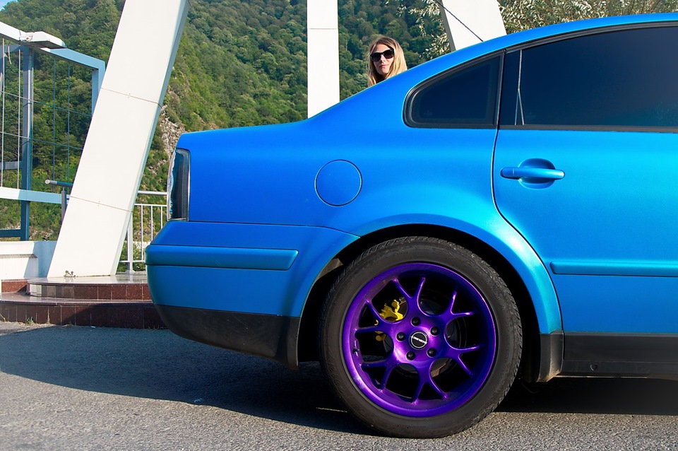 Напомню, что основная идея тюнинга Пассата — это максимально сохранить практичность. Ибо это авто на каждый день и путешествий. Так что, никакого экстрима и низкого профиля. Купила правильные для немца BORBET BS на 17", очень легкие. Тут же отдала их в "ДискоКрас", где их по красили в "фиолетовый кэнди" по всем строгим нормам порошковой окраски. Рекомендую красить диски только у профессионалов своего дела. Никакой экономии на замене песка и пр. Спасибо еще раз, Ринат! (Gshock) Диски от Марка будем обновлять тоже только у него.
