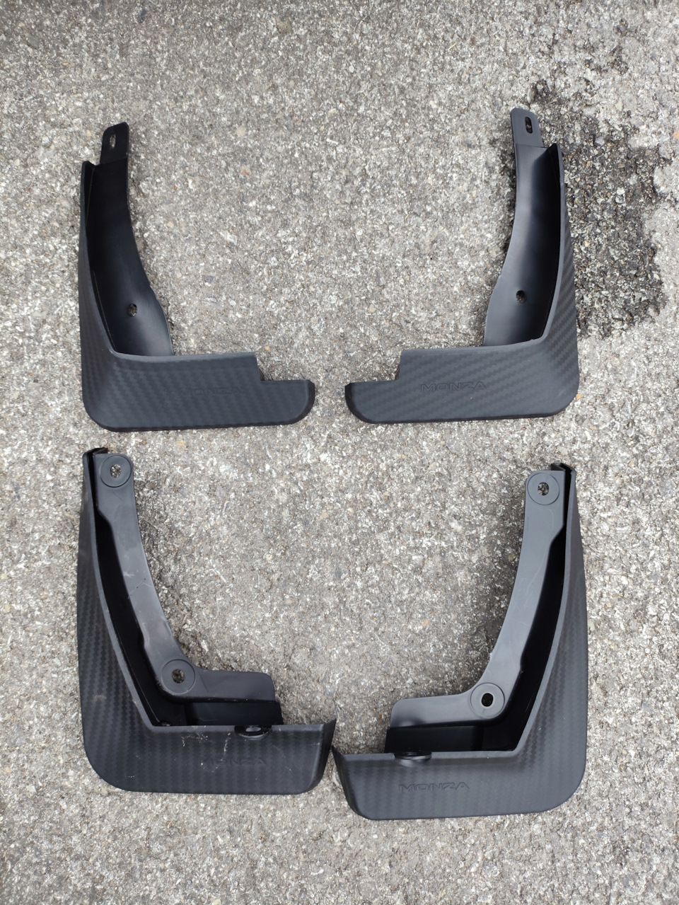 До этого при покупке автомобилей брызговики были все, ну или хотя бы передние, на монзе видимо для экономии их вообще не установили (а мы ругаем АВТОВАЗ, что он только передние ставит). Изучив предложения на маркеплейсах, заказал комплект от наших азиатских партнеров, доставка была долгой видимо везли из самого Китая. На вид брызговики под карбон, из дубового пластика (изучил все маркеплейсы, они все из пластика, видимо резина кончилась).