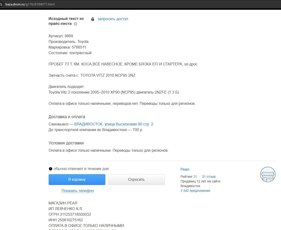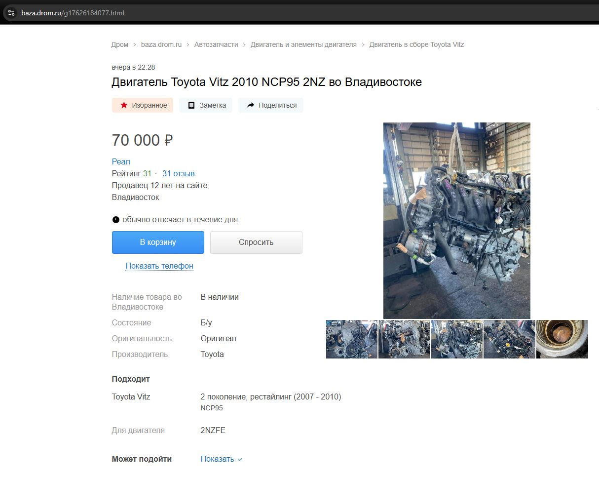 Нашел так же и отдельно коробку, стоит у нас в НСК от 39 000 р. Редукторов отдельно не нашел, все продают только с коробкой! Нет движков хороших в НСК, а те что есть стоят очень дорого, да ещё и не один двигатель не с Toyota Vitz! Продают ДВС с Toyota Platz, Toyota Belta, Toyota Corolla, Toyota Funcargo, Toyota ist, двигатель 2NZ ставился на мноооогие машины! Не мой вариант, хочу движок с минимальным пробегом, свежее годом и дешевле раза в полтора, в два тех что в НСК и чтоб в сборе был с навесным и АКПП и редуктором и чтоб фирма по продаже движков была проверенная, надежная! Скажете, это фантастика?))) К счастью — это реальность! В Новосибирске все эти движки привезли с дальнего востока и перепродают с накруткой по «рыночным» ценам! А если движок привезти с дальнего востока самим, он перестаёт быть таким дорогим! 😉 Смотрю двигателя во Владивостоке, много движков, снятых именно с такого же Toyota Vitz как у меня, именно с моего кузова NCP95, именно 2NZ 1.3 литра, то что мне нужно!