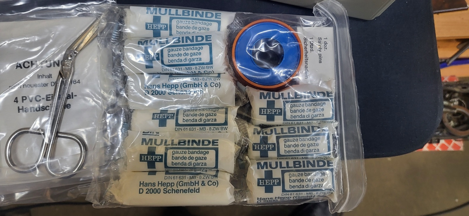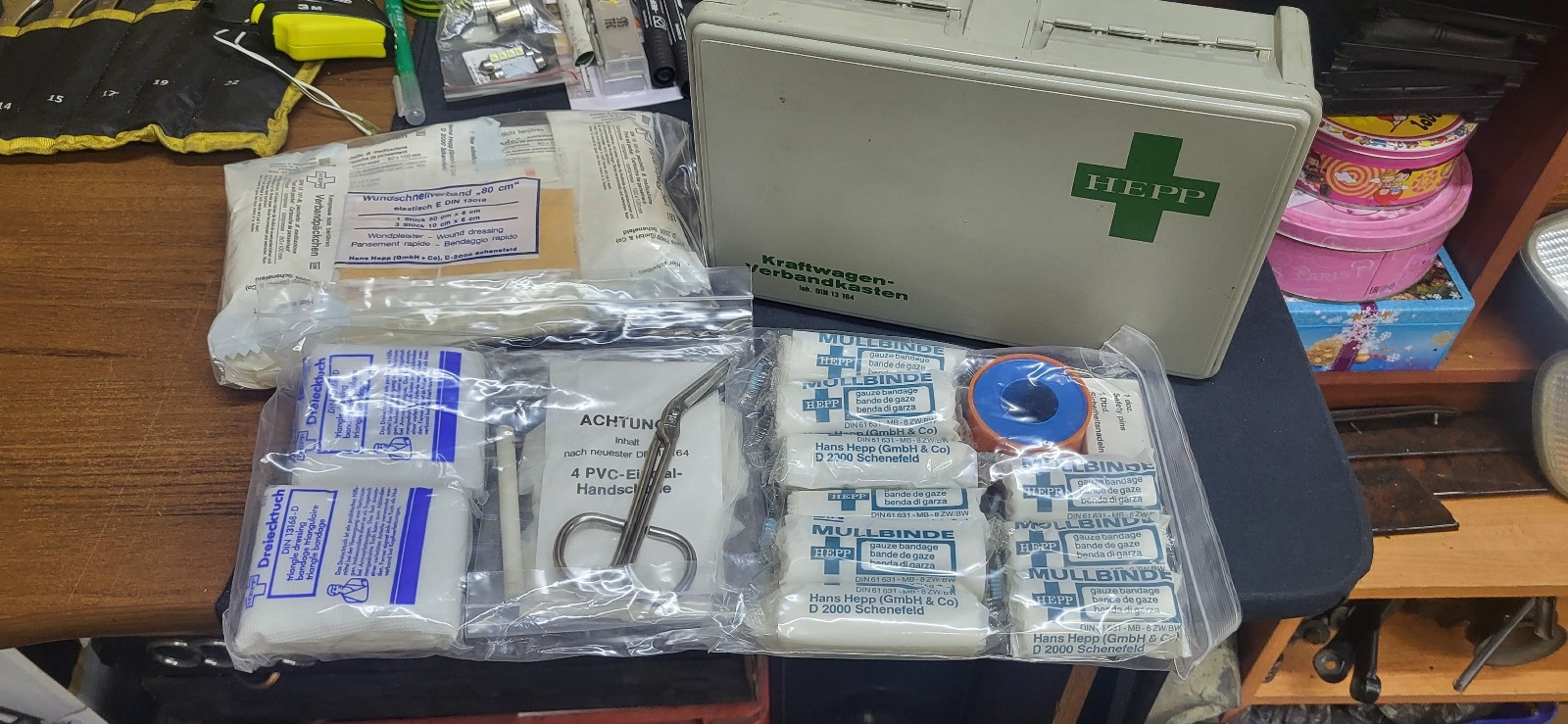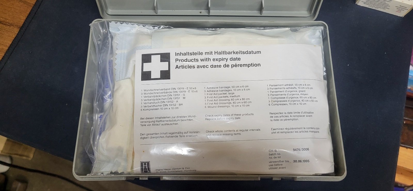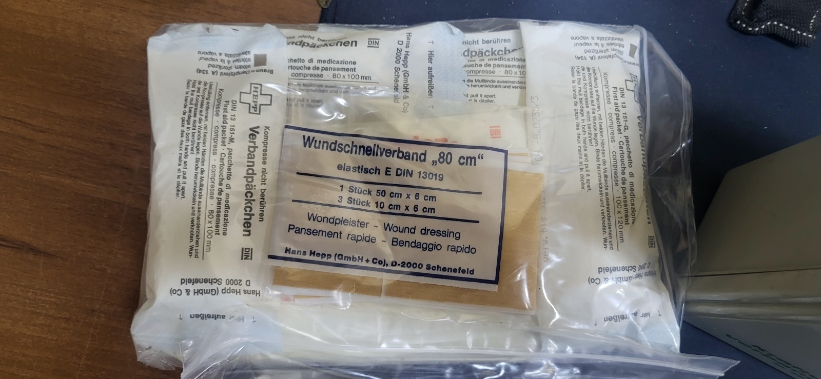 Все правильно сделал — немецкие бинты и прочее, пусть даже и тридцатилетние, по качеству не сравнятся с тем хламом, что продается сейчас. В аптечке w124 помнится, было наполнение производства Hartmann.