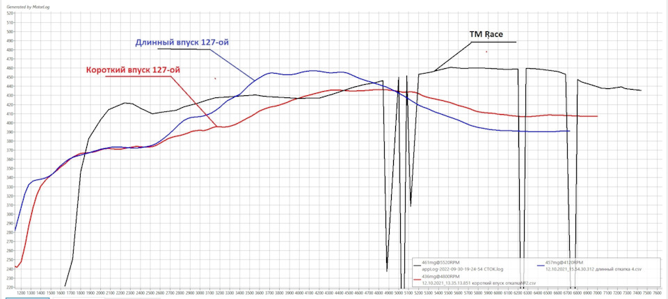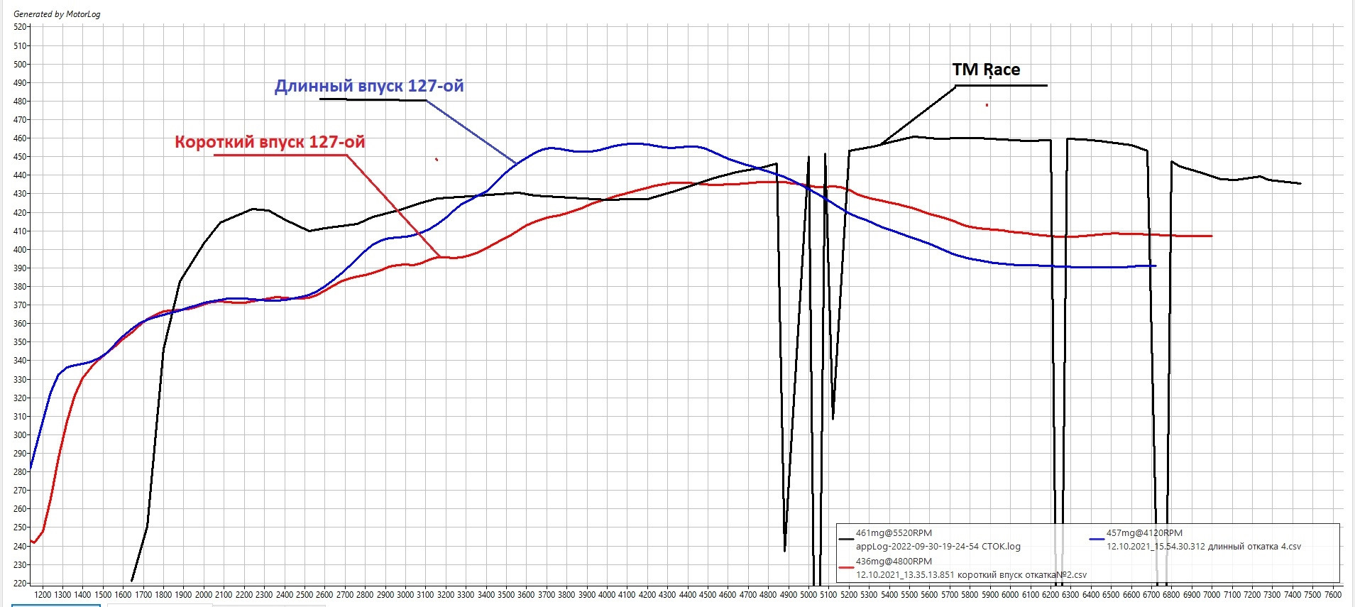 Вот график в доказательство: Синяя линия — цикловое наполнение мотора с закрытыми заслонками. Красная линия — с открытыми.
