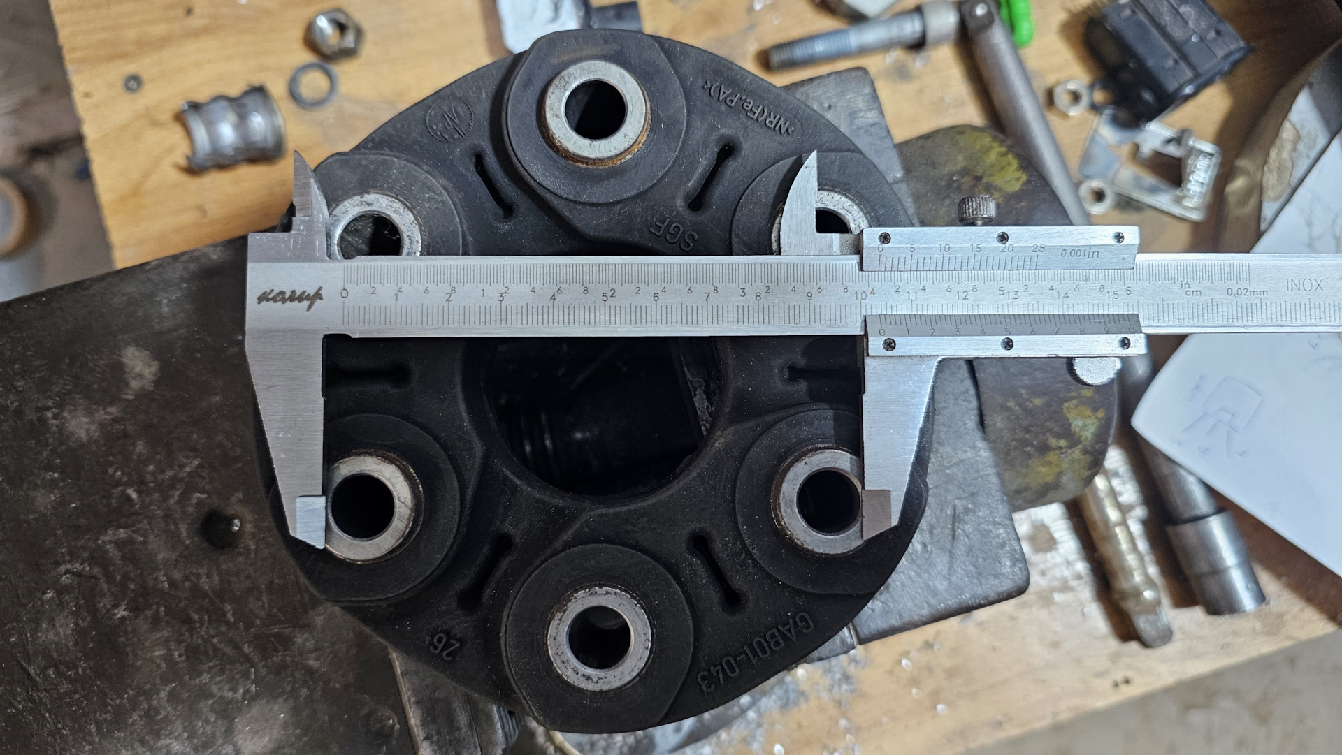 С точностью замеряю "уши" хвостовика, эластичной муфты штангенциркулем, чтобы повторно так не попасть и домой за поисками.