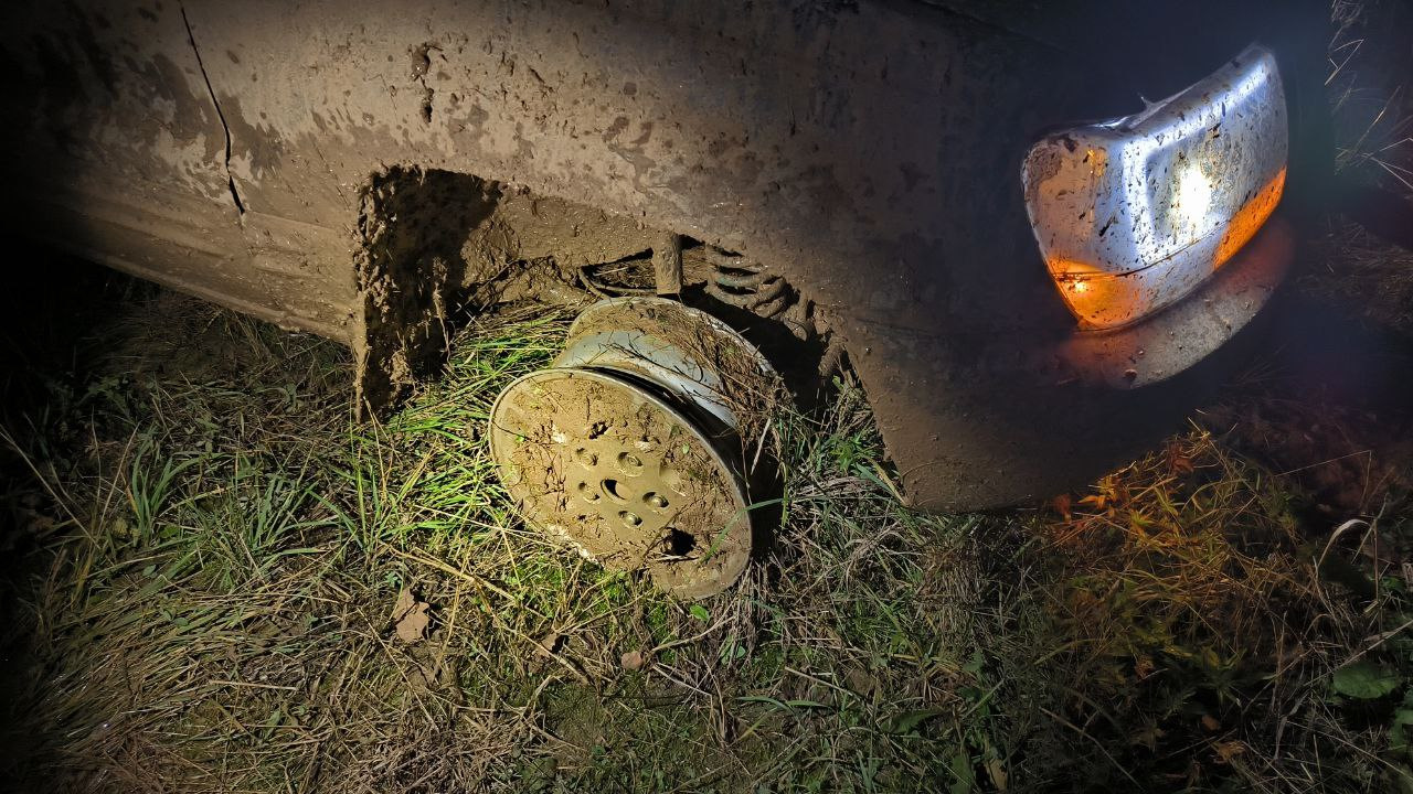 И вот, в какой-то момент я решил в своём стиле проехать одну неприятную лужу и дал по газам, но не рассчитал и лишился сразу двух передних колёс — разборт.