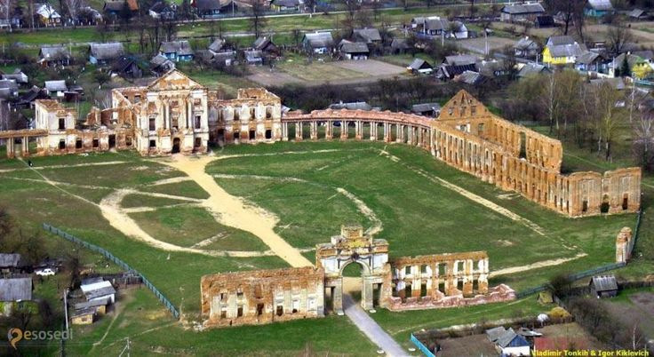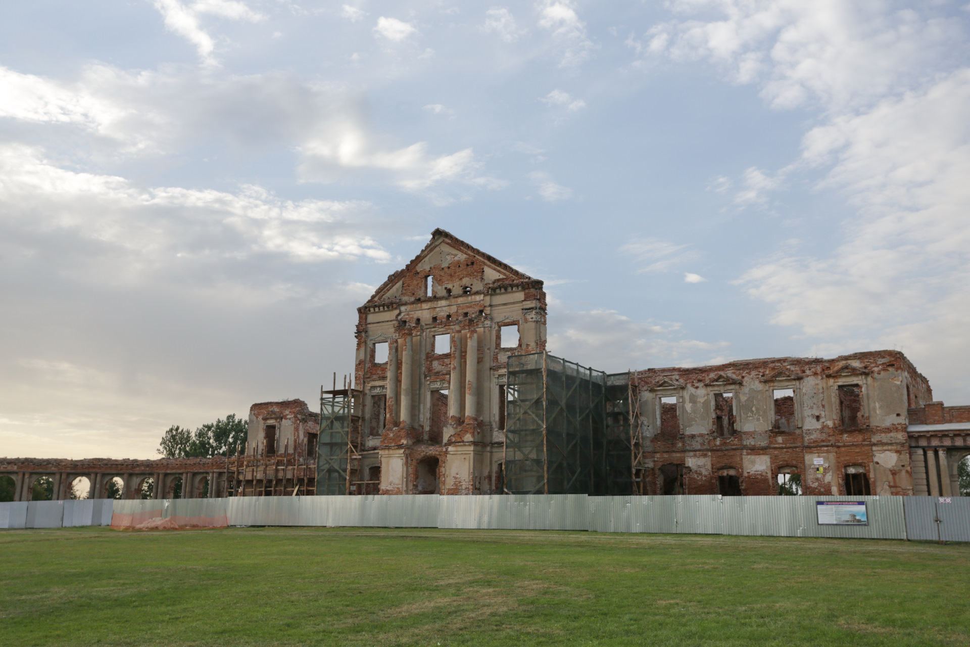 Дворец Сапег (52.85986, 24.89588). Находившийся в начале XVIII века в Ружанах родовой замок Сапег был разрушен в ходе войны со шведами, и во второй половине XVIII века на его месте был построен дворец в стиле классицизма. Дворец сильно пострадал в Первую мировую войну, сейчас представляет собой живописную руину. В настоящее время идёт воссоздание замка заново. Входную группу и дворец справа от входа (театральный корпус) уже полностью восстановили. На первой фотографии — вид сверху, как это всё выглядело ДО восстановления.