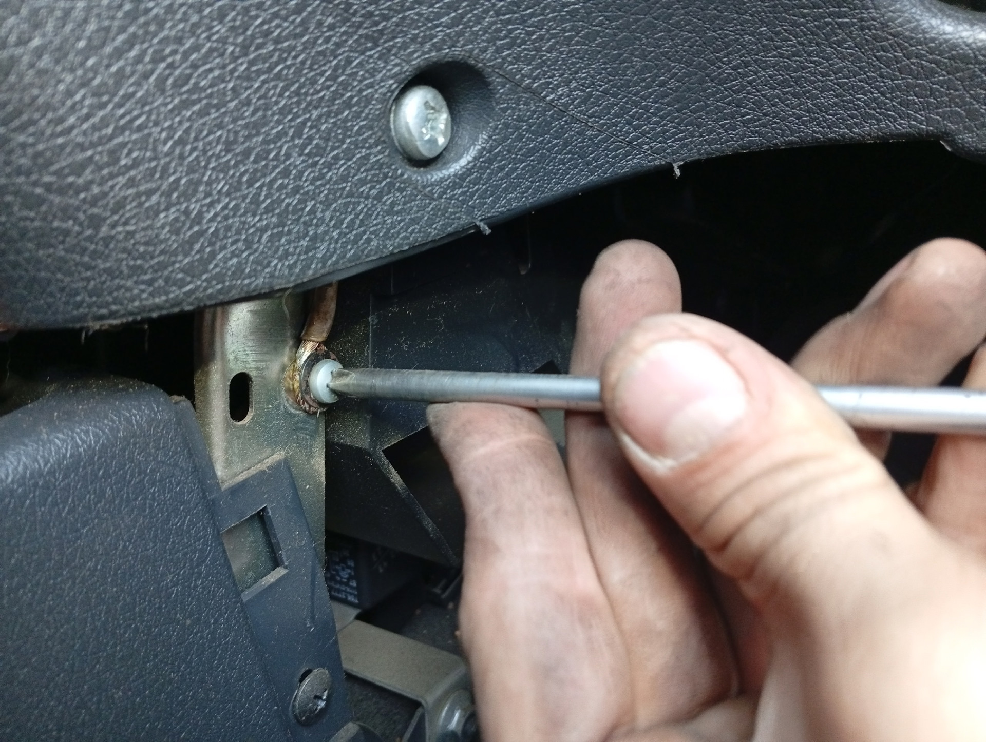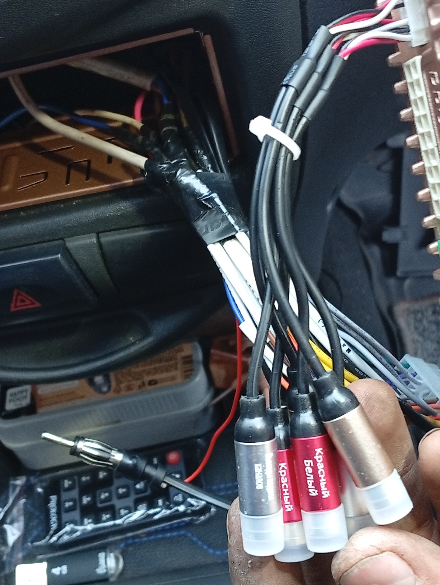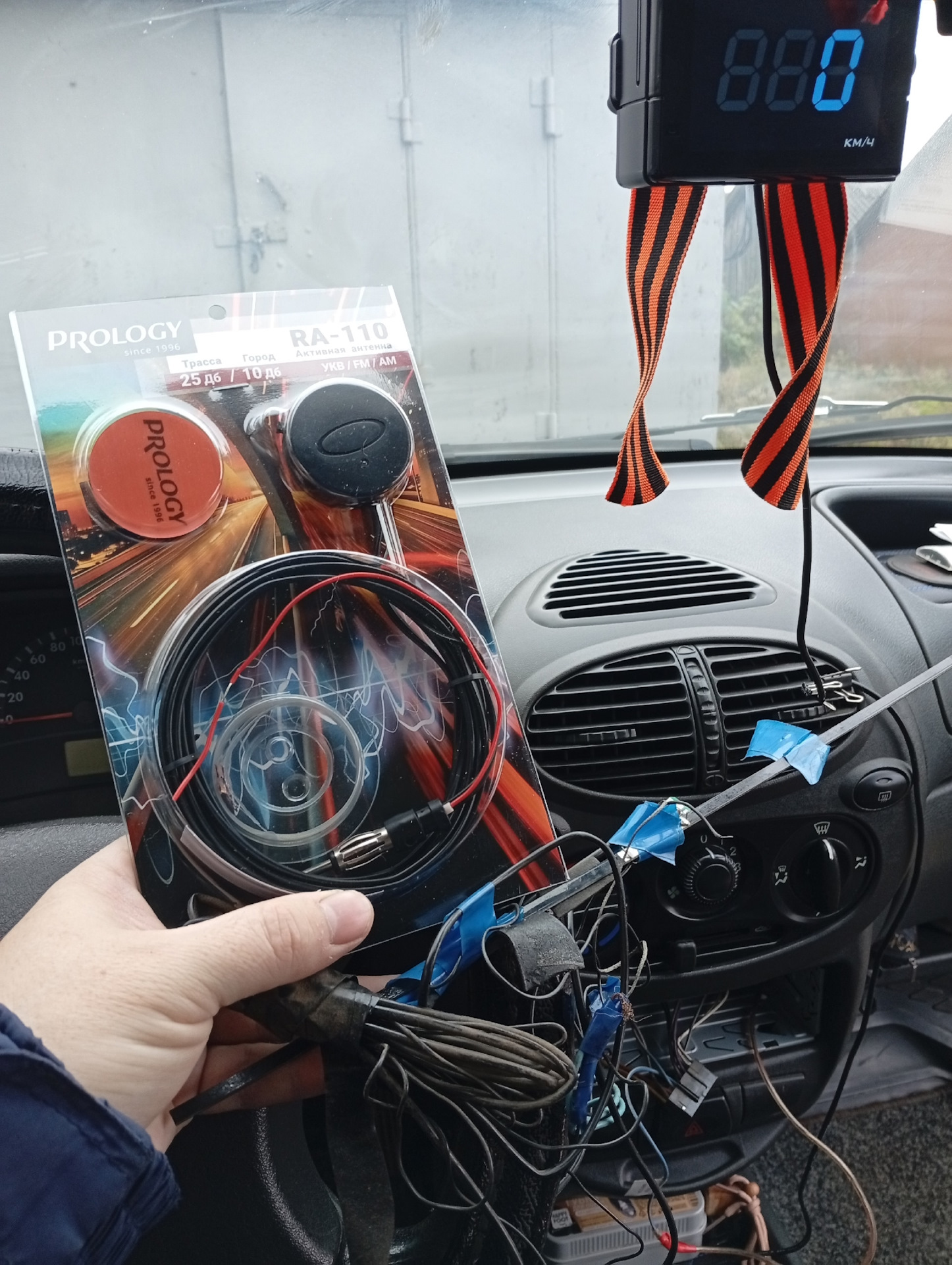 Кабель питания к магнитоле провели под обшивкой и панелью, минус к кузову прикрутили винтом солнцезащитного козырька. "Зеленый" индикатор соответствует режиму "город" — 10 дБ, "красный" — "трасса" — 25 дБ (переключатель на корпусе антенны).
