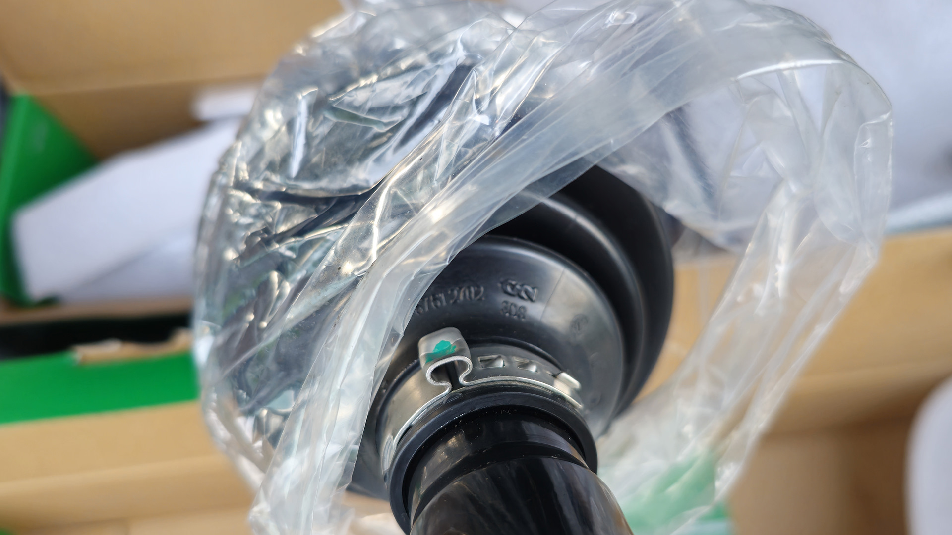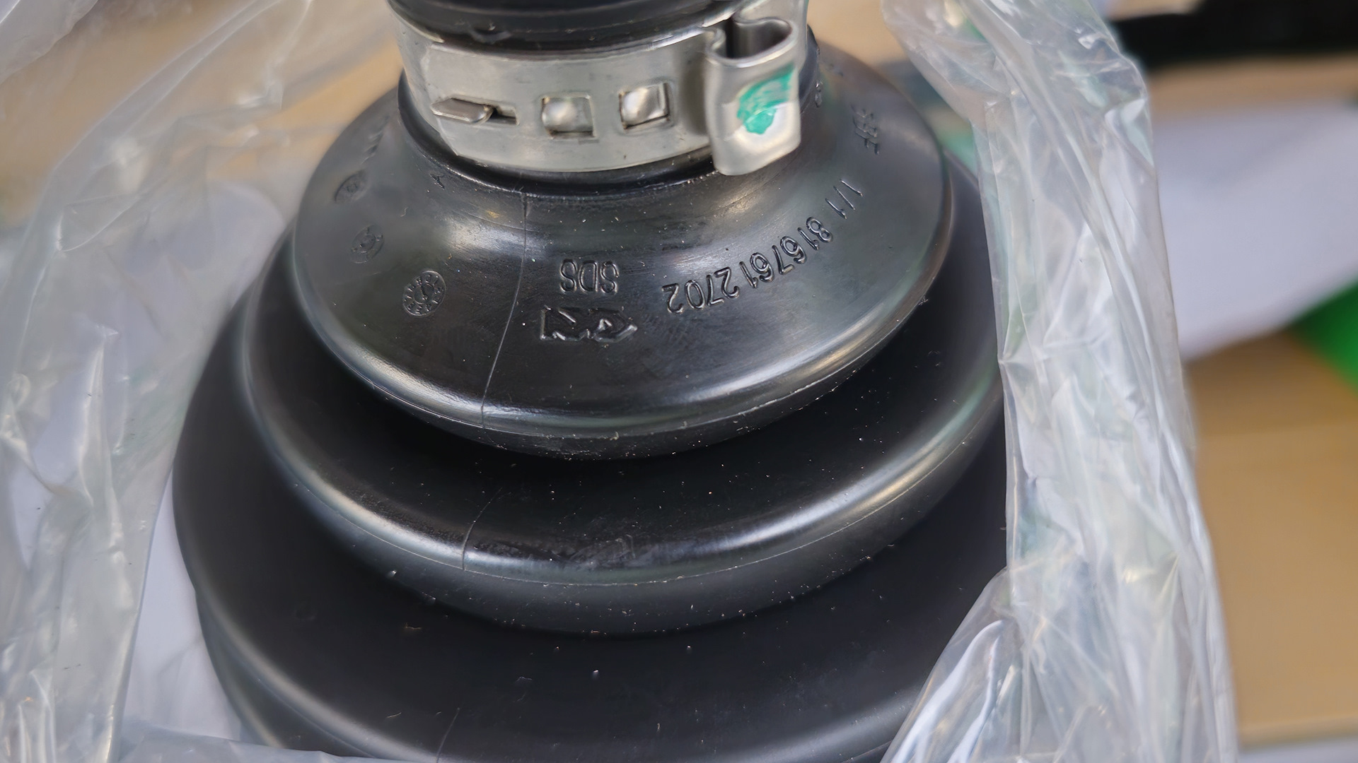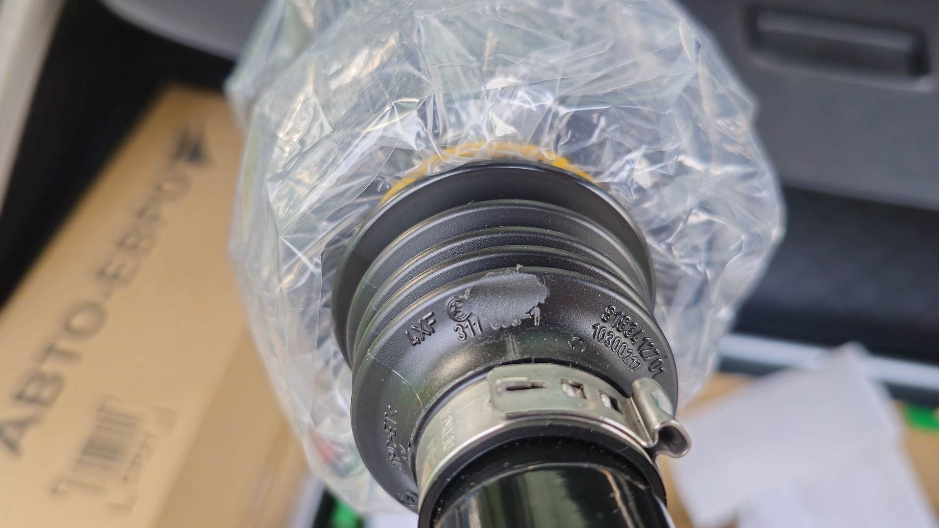 Друзья, такое дело. Из под пыльников наружных шрусов потихоньку выдавливало смазку. И не помогло даже переобжатие пыльников на палке спец. инструментом с нужным моментом затяжки. Виной тому то, что предыдущим владельцем не были нормально обжаты хомуты в месте соприкасания палки-пыльника. Постепенно краска там стерлась до блестящего металла и теперь на ней и не общать толком. Так то можно было бы и снять палки, отпескоструить, отдать в порошковую окраску. Но с учетом того, что триподы все равно уже с пробегом в 450к, то решено было эти приводы отпустить на пенсию и поставить новые в сборе и не выкраивать.