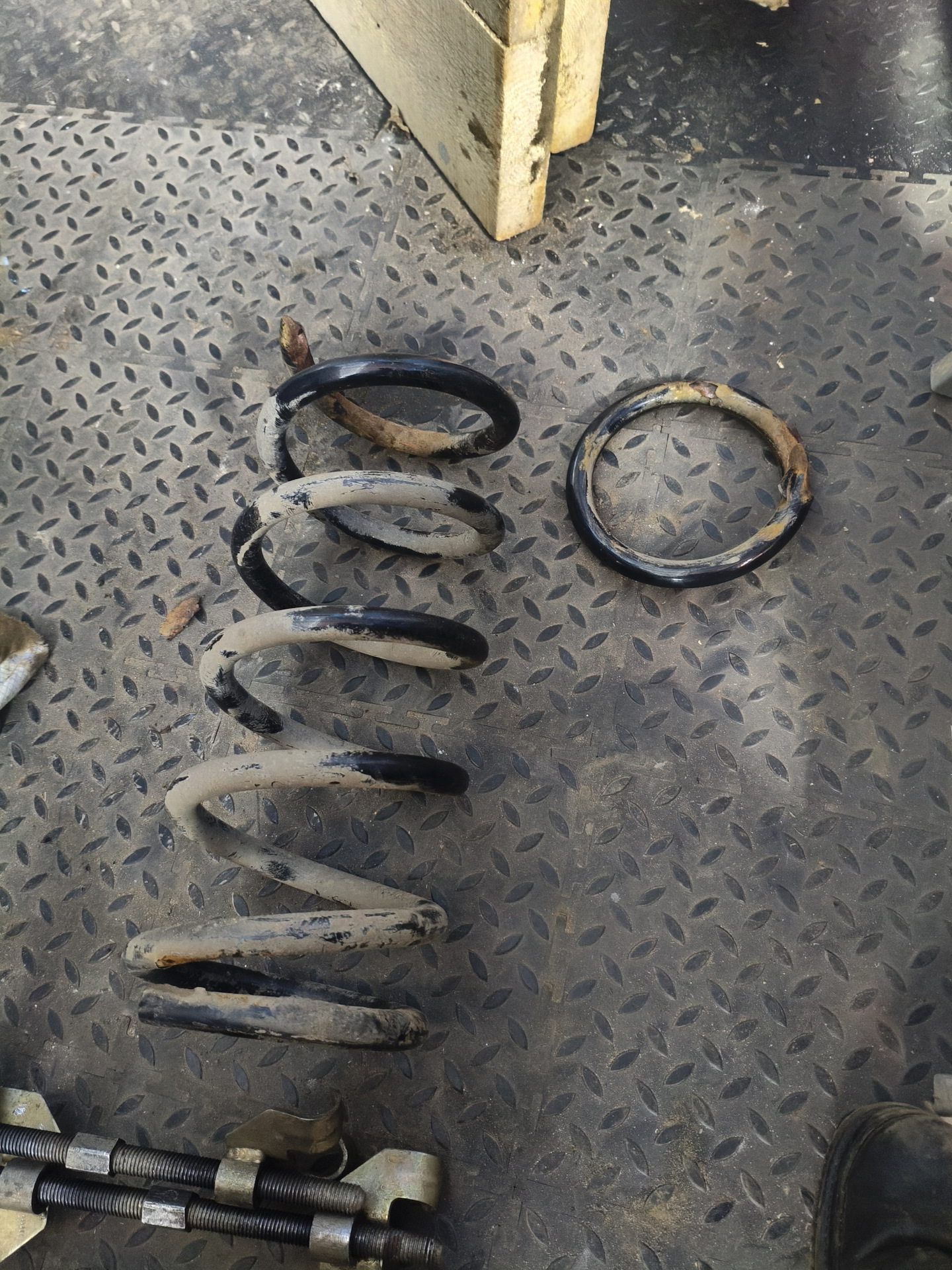 Загнал машину в гараж для сезонной смыны колёс. Залез в яму и обнаружил, что обе задние пружины лопнули. Видимо давно, срез весь ржавый.