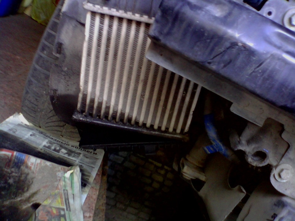 Съезжаю на обочину и осматриваю авто. Под капотом патрубок цел, вижу как с правой стороны под бампером закапало маслице, взгляд на кулер и не верю глазам от увиденного оторвало нижнюю пластиковую часть.