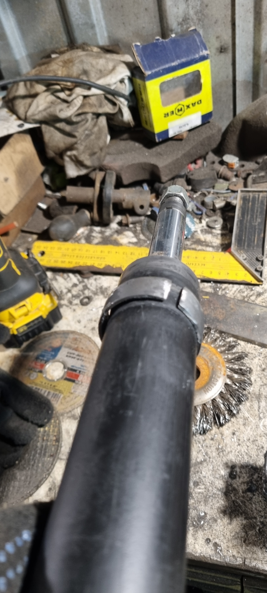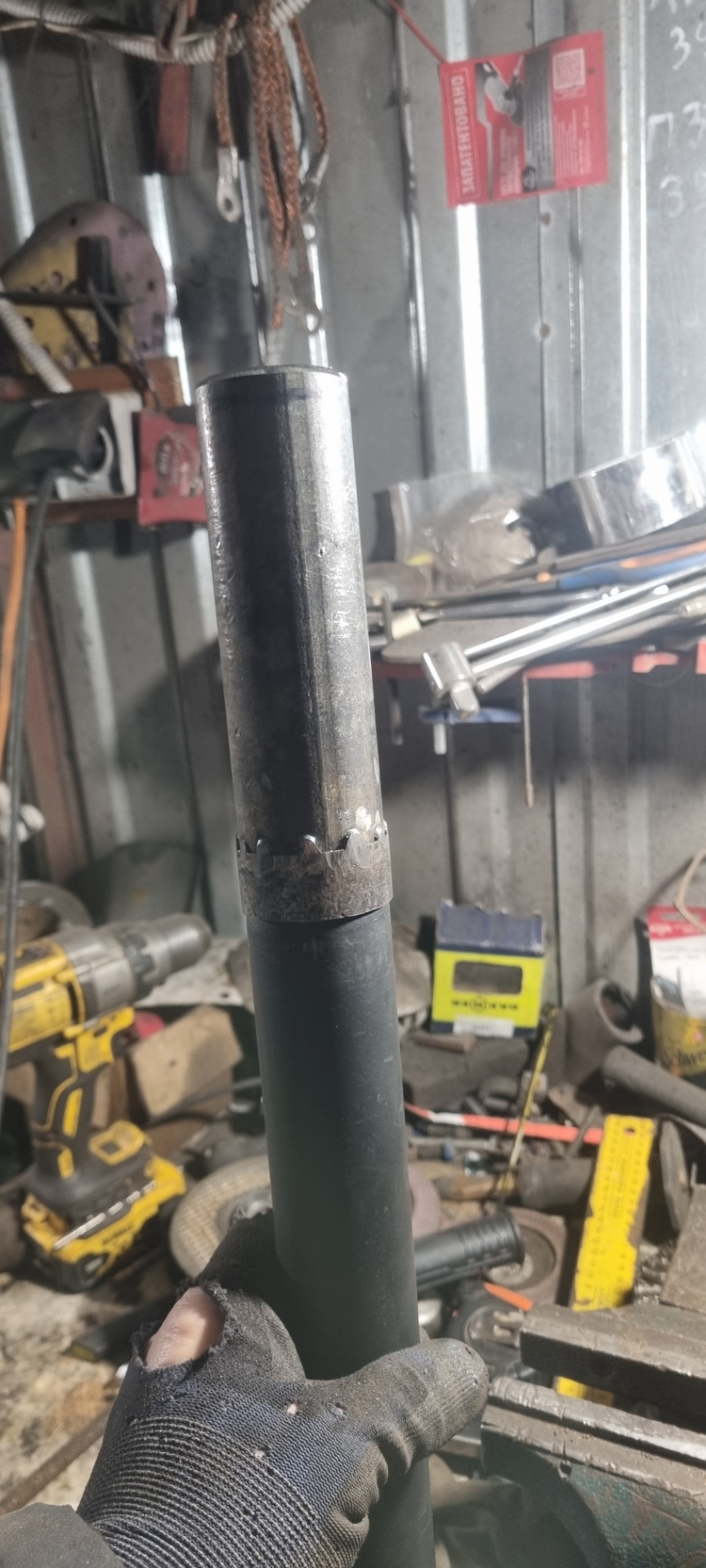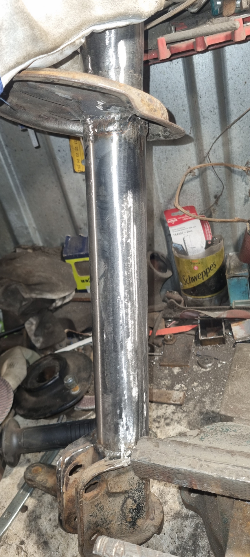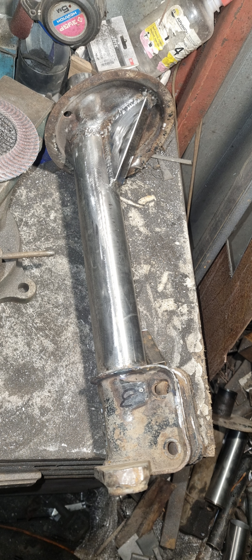 Врезал куски трубы такого же диаметра как корпус стойки длиной 70мм, и на верх те же отпиленные резьбовые втулки. Отцентровал на валявшемся картридже Фенокс( он почти плотно входил в корпус), и обварил .