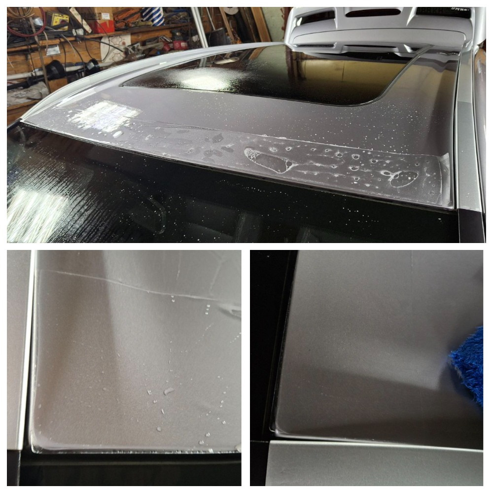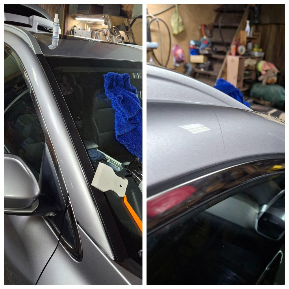 Поэтому я приступил к поклейке пленки на крышу. Самое главное – зафиксировать края у рейлингов. Сначала один, потом с натяжением другой, с выставлением 1см пленки на подгиб к резинке лобового стекла. Пленка отлично тянется и никаких бугров и складок потом не образуется. Затем центральную часть тянем к лобовому и просто выгоняем мыльную воду. Тоже дал немного времени схватиться клею.
