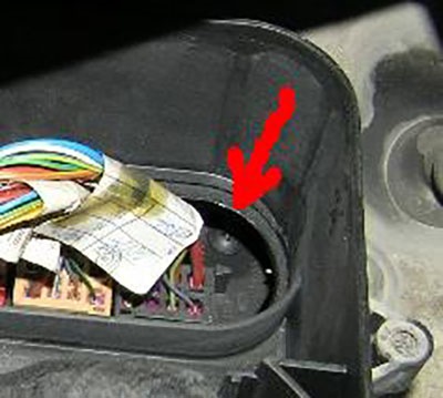 — Станет видно планку с разъёмами, её нужно открутить, держится она на двух винтах по бокам. Для откручивания понадобится тонкая длинная отвертка. Левый винт откручивается достаточно легко, а вот с правым прийдётся повозиться, т.к. он спрятан за кузовом: