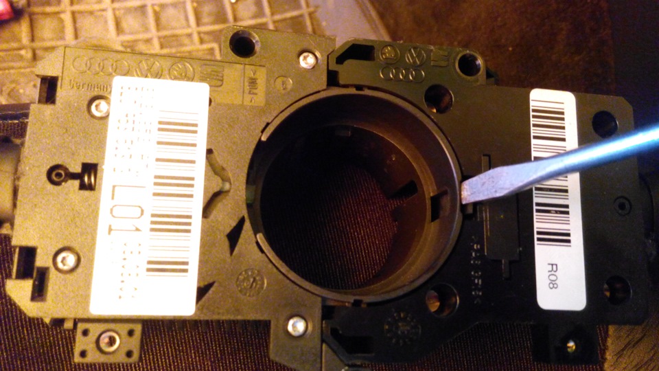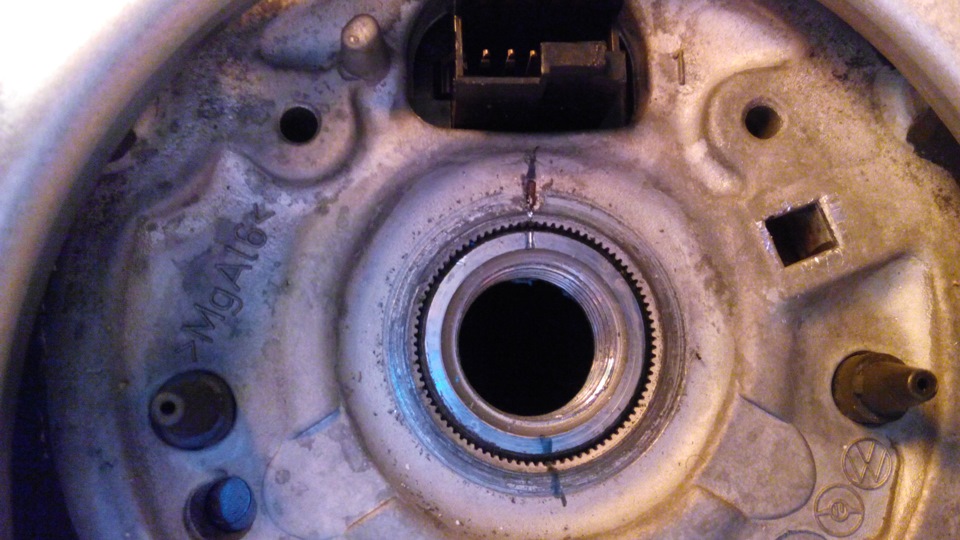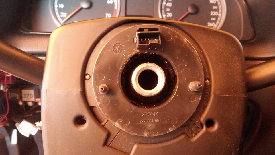 — Снимаем контактное кольцо, оно держится на довольно хрупких защелках.Т.к. в кольце есть датчик положения руля, многие пишут, что нужно его обязательно закрепить скотчем, что бы он не сбился, но всё гараздо проще, когда его будете устанавливать обратно, нужно чтобы разъём смотрел вверх, а в окошке был жёлтый кружок