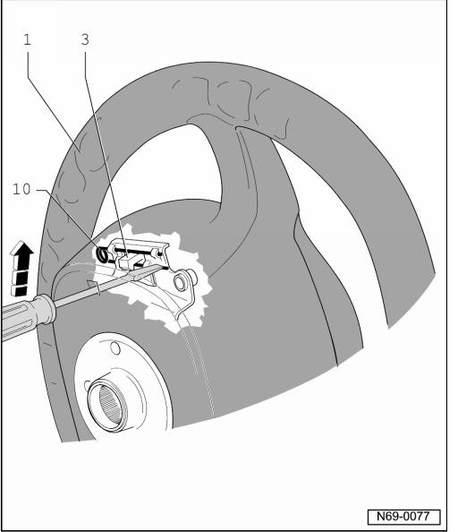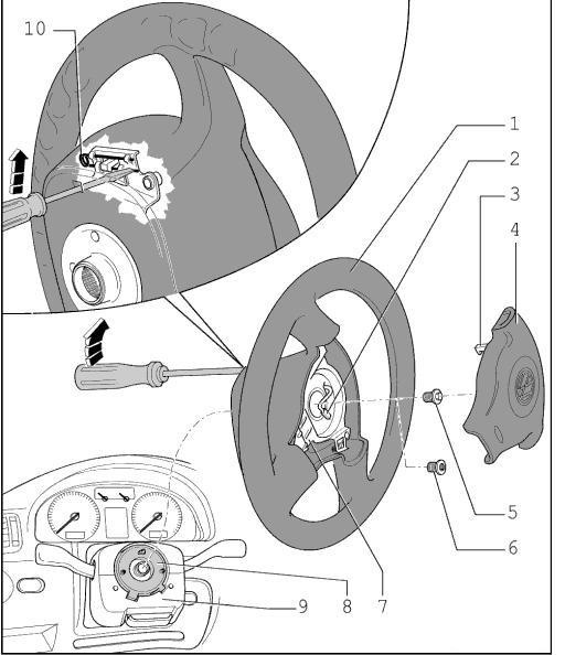 На деле же всё просто, поворачиваем руль на 90 град., берём плоскую отвёртку, вставляем в отверстие до упора, одной рукой тянем отвёртку вверх, а второй аккуратно тянем край подушки на себя.