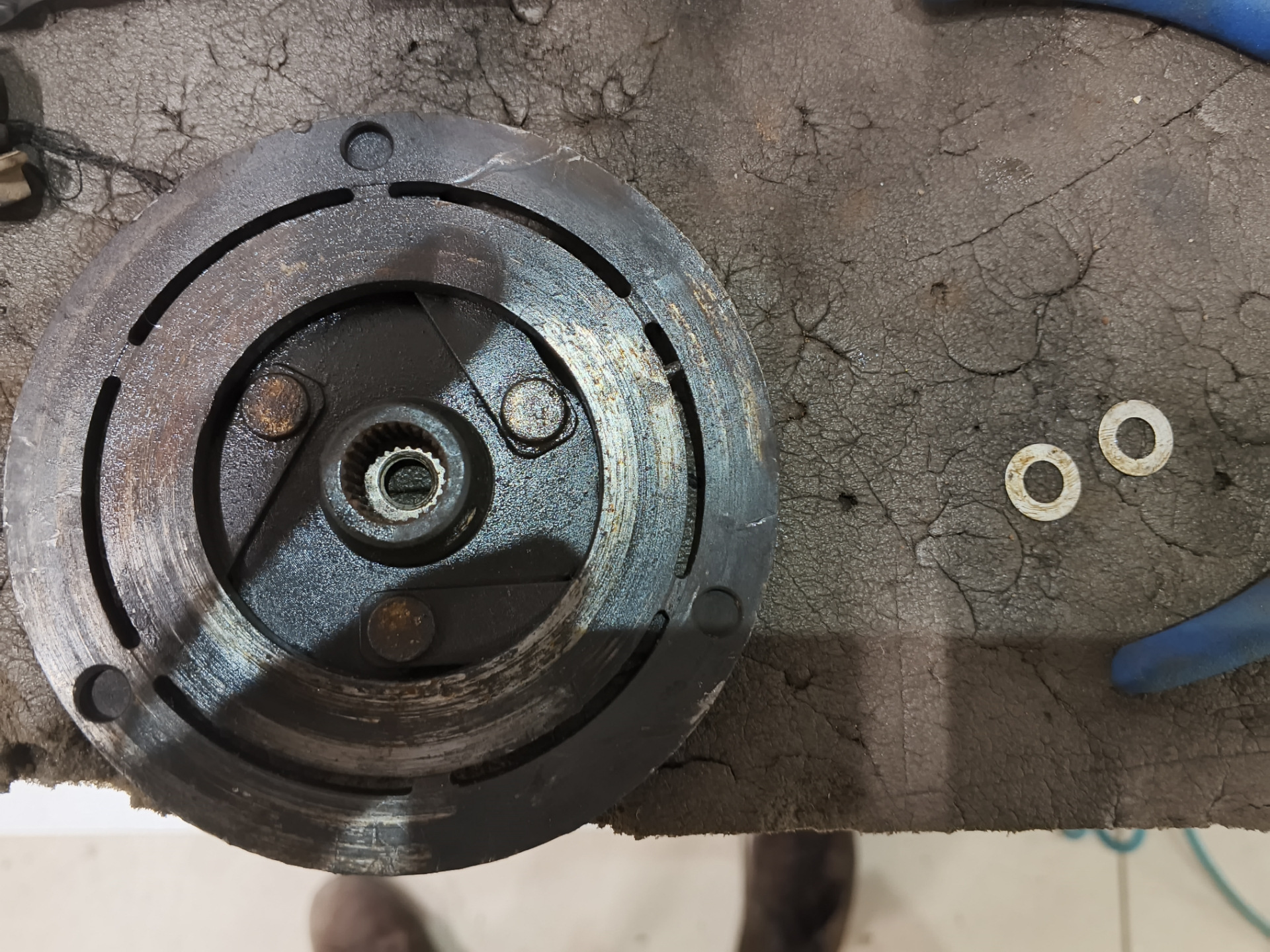 В инете есть много видео по снятию муфты не потеряйте пожалуйста прокладки между магнитной системой и шкивом. Промучился я кстати часа 4 в общем. Прежде чем снимать я нашел в бывшем Рено подшипник и удостоверился что он точно есть. Снял всю приблуду выпресовал подшипник сходил в Рено взял новый и запрессовал, внешне ничем не отличается, но есть один нюанс 😁.