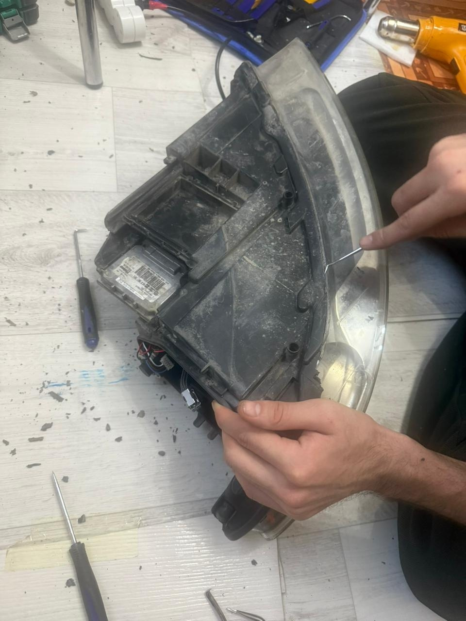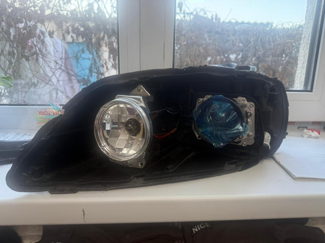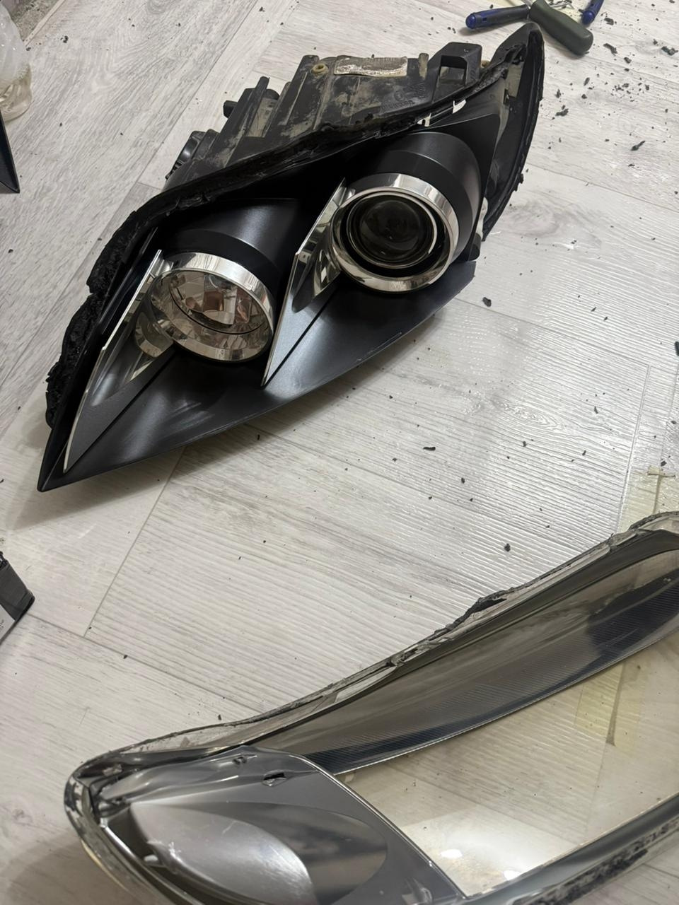 Разборка фар не сложная но муторная надо терпение греть феном корпус до токого состоянии что бы мягким но не сплавить и уже потом не много отгенать и выковыривать герметик. Этот герметик жёсткий даже не греется феном ни горит не меняет свойства вообще. Итак потихоньку убирать герметик снаружи а потом уже во внутрь просовывать ковырялки без фанатизма греть постоянно и ковырять.ну потом когда разберете там хром будет сним надо аккуратно он сразу отходит хром если задеть я свой хром по красил в черный мат с баллончика по пластику. Хром отмыл в воде с тряпкой. Если хотите оставить хром не надо его трогать или мыть очень нежный он. Если будете красить пластик фар то есть моменты. Надо сначала грунтовкой по пластику на нести напыление не большими порциями грунтовать из далека в слоев семь восемь проходить. Если сразу начнёте грунтовать за раз то ваш пластик треснет. Если есть возможность то найдете грунтовку без растворителя. Подключение линз простое питание до блока ксенона отрезать и на линзу запаяить красный плюс, чёрный минус это основной свет, а шторку штатную также на линзу запаяить там белый плюс синий минус.