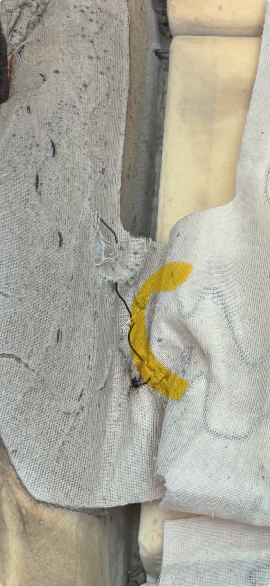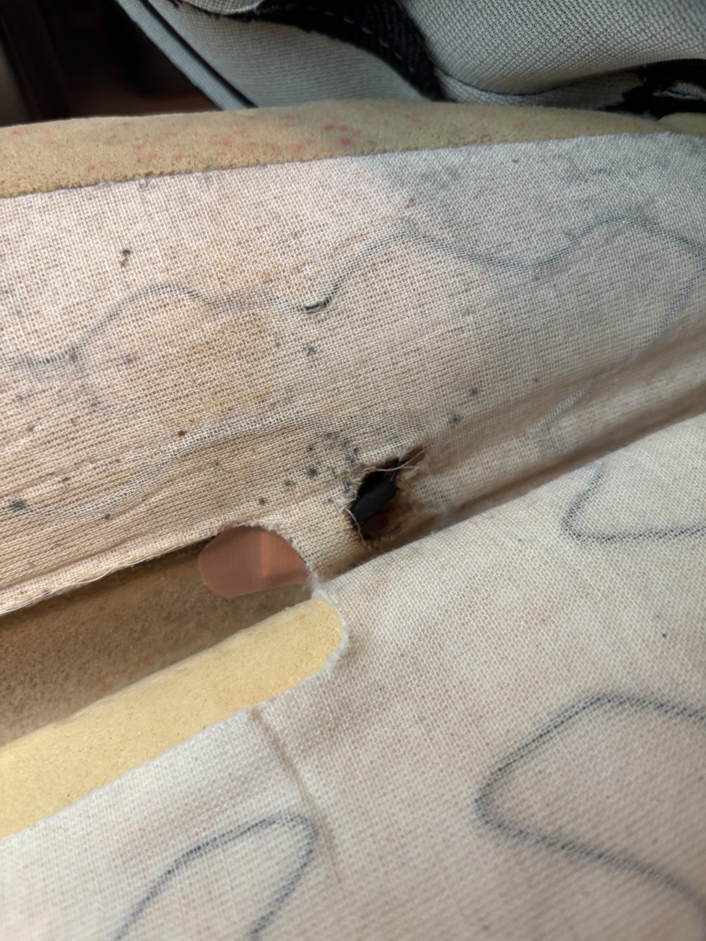 На водительском сидении прогар был в том же месте, но из-за заломов мата в этом месте и плохом состояние паралона я решил обрезать нить и так же обжать гильзу, чтобы эта часть боковой поддержки не обогревалась