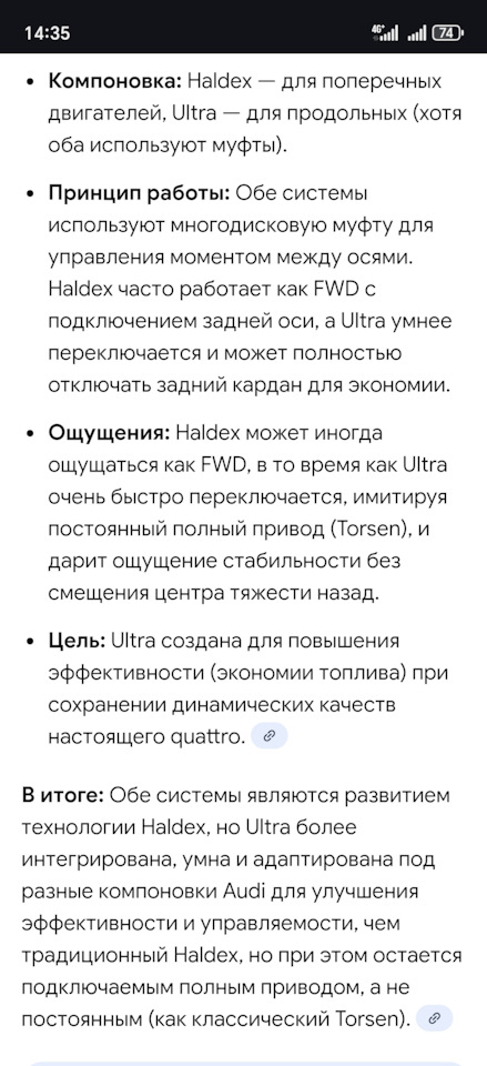 Очень здравый подход 👍 По сути, Вы подтвердили главный тезис — 99% водителей реально не упираются в пределы ни Ultra, ни Torsen. Ultra требует чуть большего внимания к обслуживанию, зато даёт экономию и комфорт в повседневной езде. А разницу в возможностях в реальности смогут использовать единицы — либо на треке, либо в реально жёстком бездорожье. Для обычной жизни вопрос «какой quattro настоящий» вообще не имеет смысла.