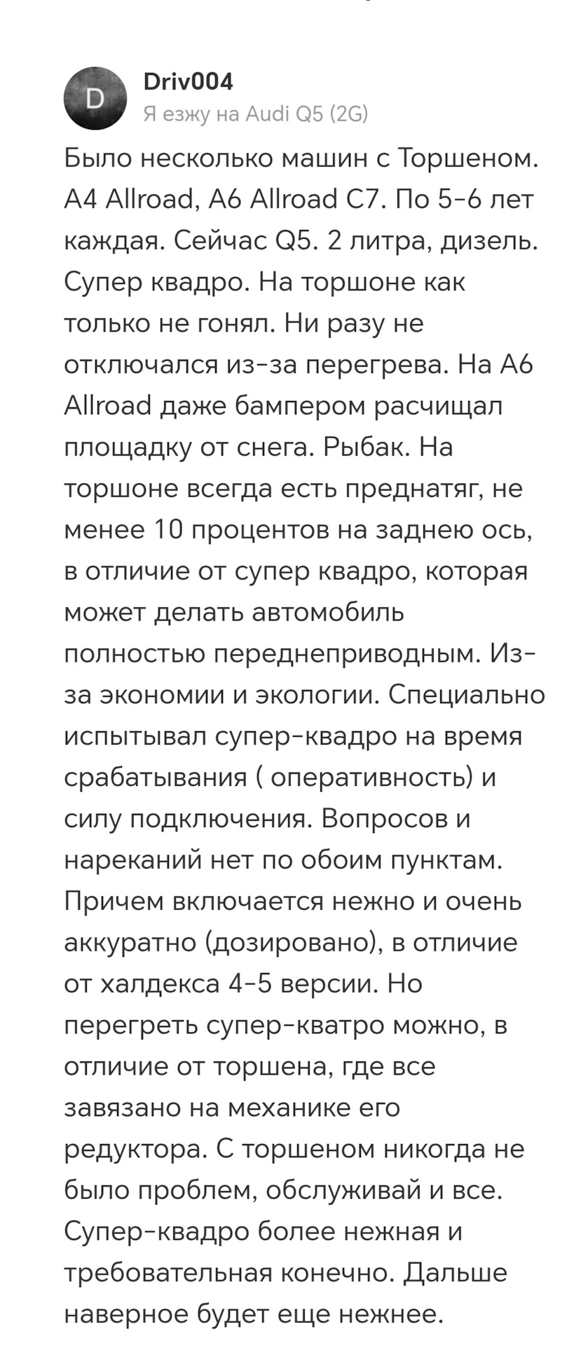 Было несколько машин с Торшеном. А4 Allroad, А6 Allroad C7. По 5-6 лет каждая. Сейчас Q5. 2 литра, дизель. Супер квадро. На торшоне как только не гонял. Ни разу не отключался из-за перегрева. На А6 Allroad даже бампером расчищал площадку от снега. Рыбак. На торшоне всегда есть преднатяг, не менее 10 процентов на заднею ось, в отличие от супер квадро, которая может делать автомобиль полностью переднеприводным. Из-за экономии и экологии. Специально испытывал супер-квадро на время срабатывания ( оперативность) и силу подключения. Вопросов и нареканий нет по обоим пунктам. Причем включается нежно и очень аккуратно (дозировано), в отличие от халдекса 4-5 версии. Но перегреть супер-кватро можно, в отличие от торшена, где все завязано на механике его редуктора. С торшеном никогда не было проблем, обслуживай и все. Супер-квадро более нежная и требовательная конечно. Дальше наверное будет еще нежнее.
