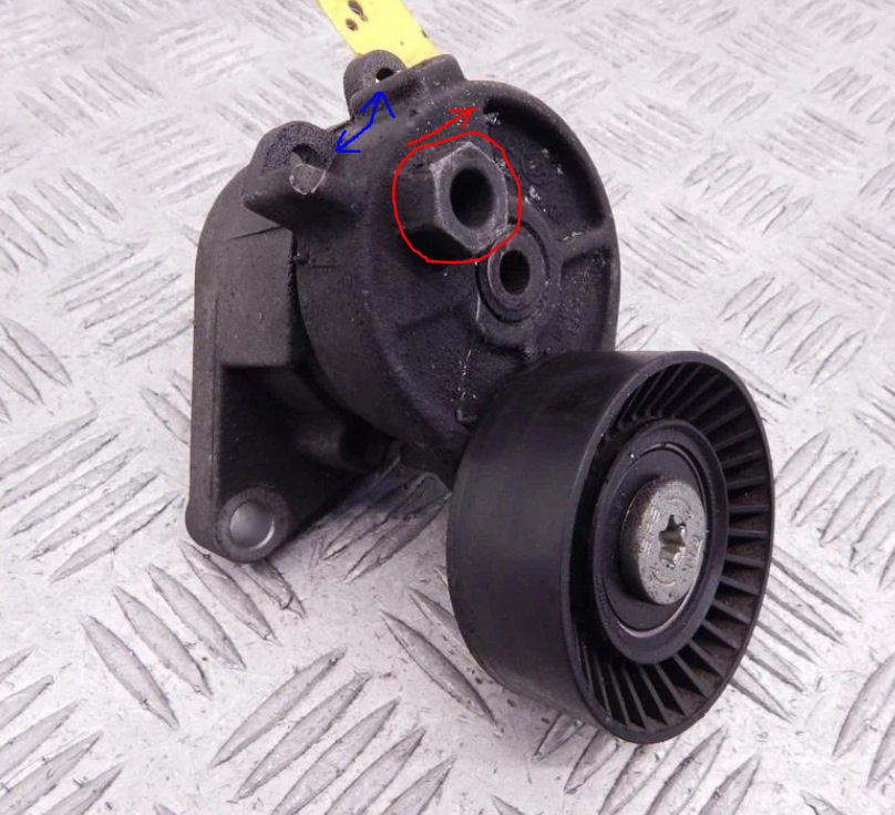 Потом нужно снять приводные ремни, их два, один приводит в движение компрессор кондиционера, другой нужен для помпы, генератора и насоса ГУРа. В БМВ пока самая лучшая система натяжения ремня мной встреченная, для снятия ремня необходимо головкой, накидным или рожковым ключом на 16 (отмеченной красным) натянуть пружину вправо для того чтобы сопоставить два отверстия (отмеченных синими стрелками) и вдеть в них штырь, тем самым зафиксировать механизм натяжения для легкого извлечения ремня. Гвоздь на роль штыря идеально подходит. Оба ремня снимаются аналогично.