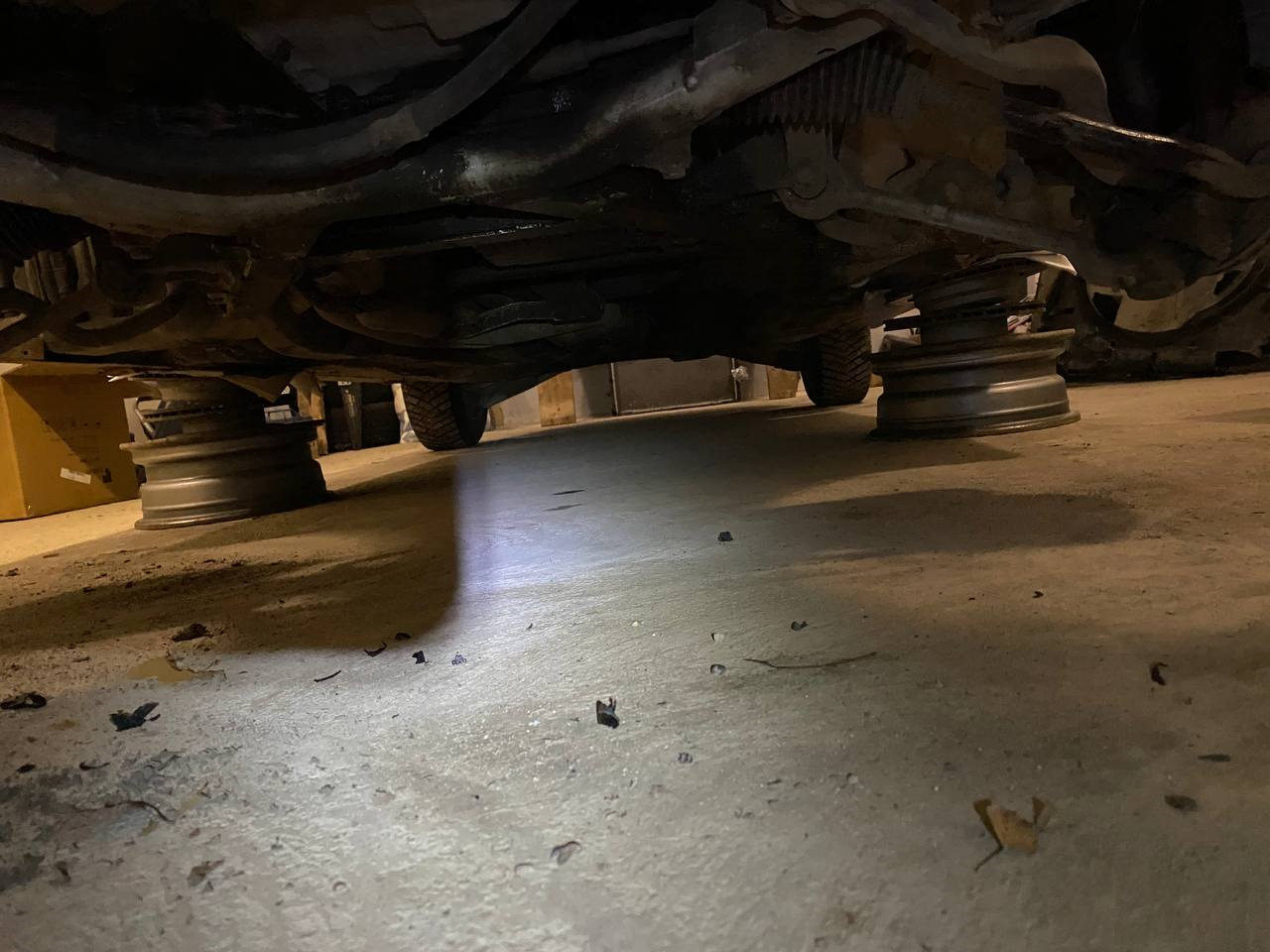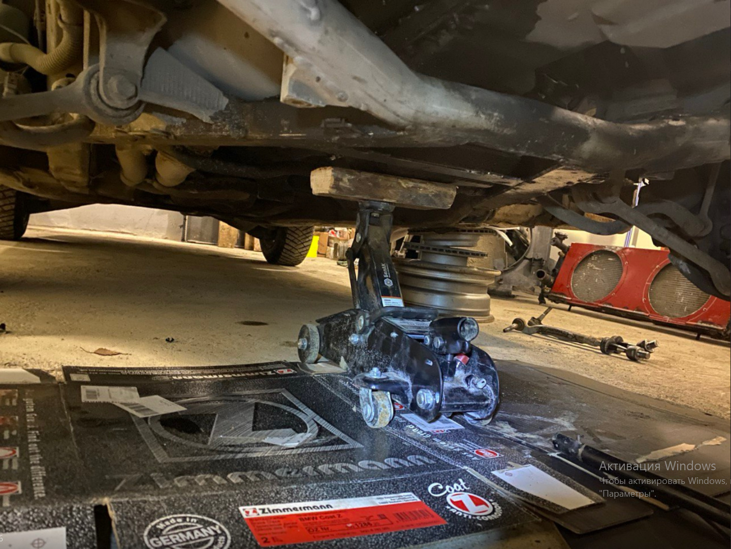 Гараж у меня без ямы по этому будет даже интереснее, сперва поднимаем тачку повыше и ставим на импровизированные подставки, аккуратно влезли с обоих сторон одинаково 14 штампы, на них передние тормозные диски от е39, на них задние тормозные диски от е39.