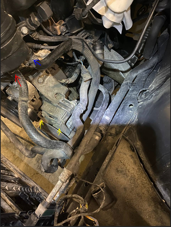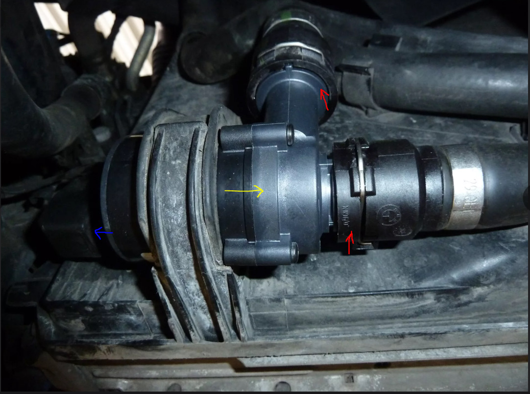 Дальше нужно снять диффузор, лезем вниз и отщелкиваем патрубки от дополнительной помпы. ❗ Осторожно, там все ещё есть антифриз ❗ Снимаем разъем с помпы и вытаскиваем по направлению желтой стрелки.