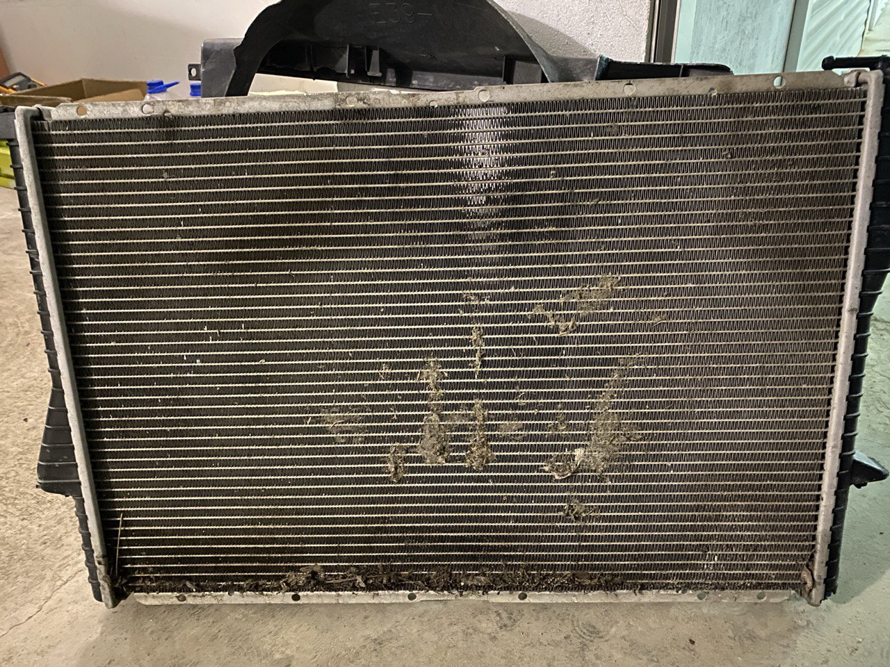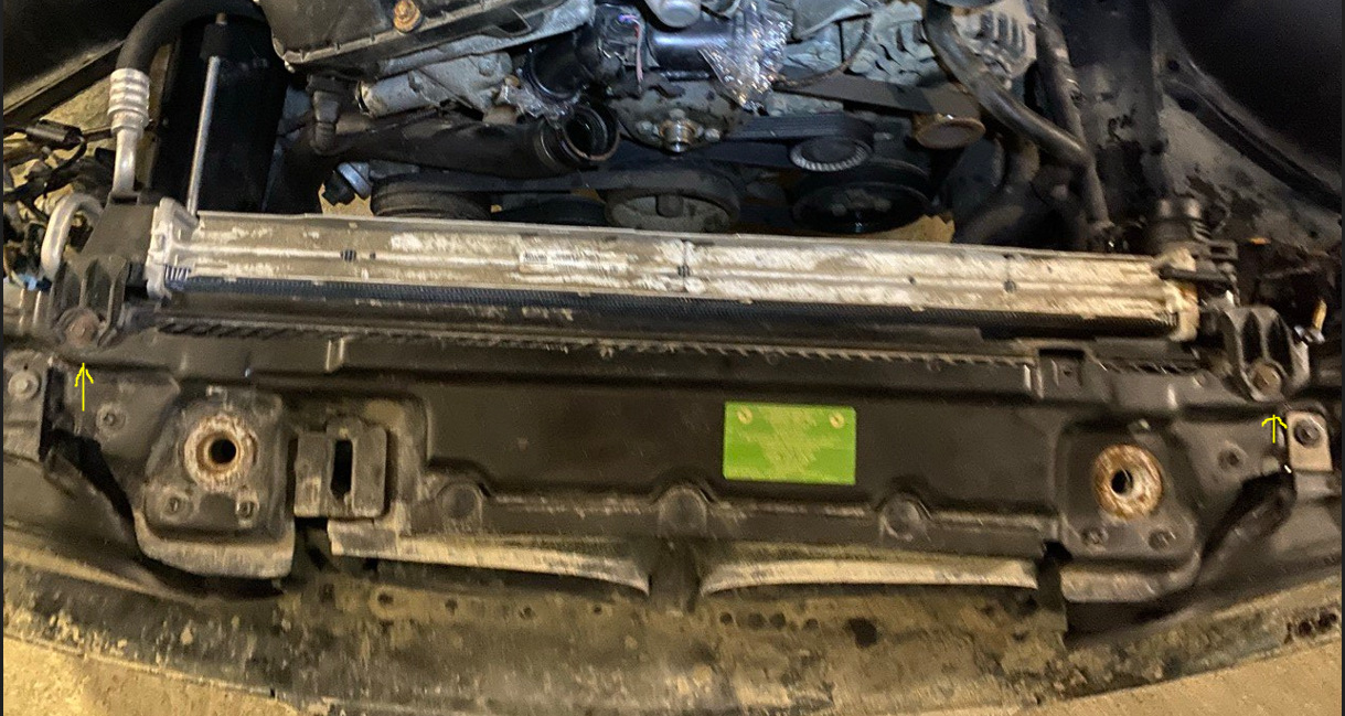 Снимаем передние колеса, защиту двигателя, сливаем антифриз откручиваем сливную пробку снизу радиатора (как это удобно реализовано на е39 в отличии от чирка) и пробку в блоке, сольется примерно 7 литров из 10,5 еще 1,5 — 2 литра сольется с патрубков когда будем снимать диффузор.