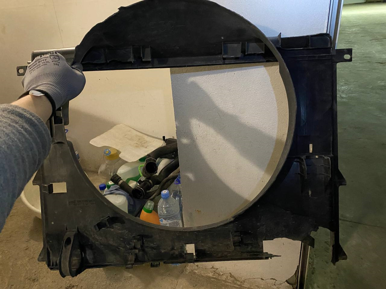 Далее откручиваем вискомуфту 👈 как её снять рассказано здесь. Отцепляем расширительный бачок от диффузора и тянем диффузор вверх.