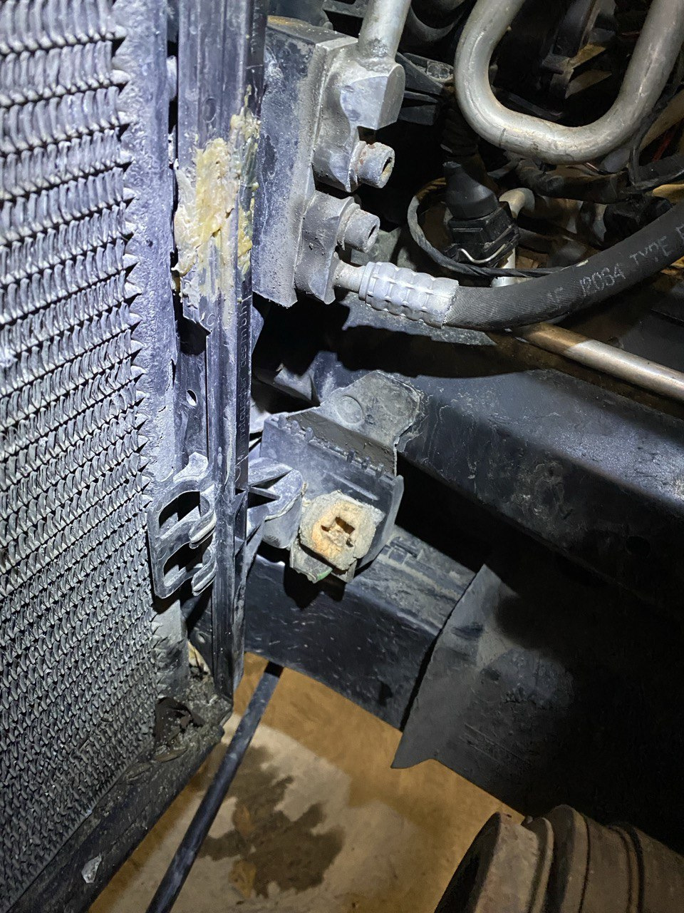 Далее снимаем радиатор охлаждения, откручиваем болты крепления кассеты радиаторов, патрубки охлаждения и слева снизу датчик температуры охлаждающей жидкости.