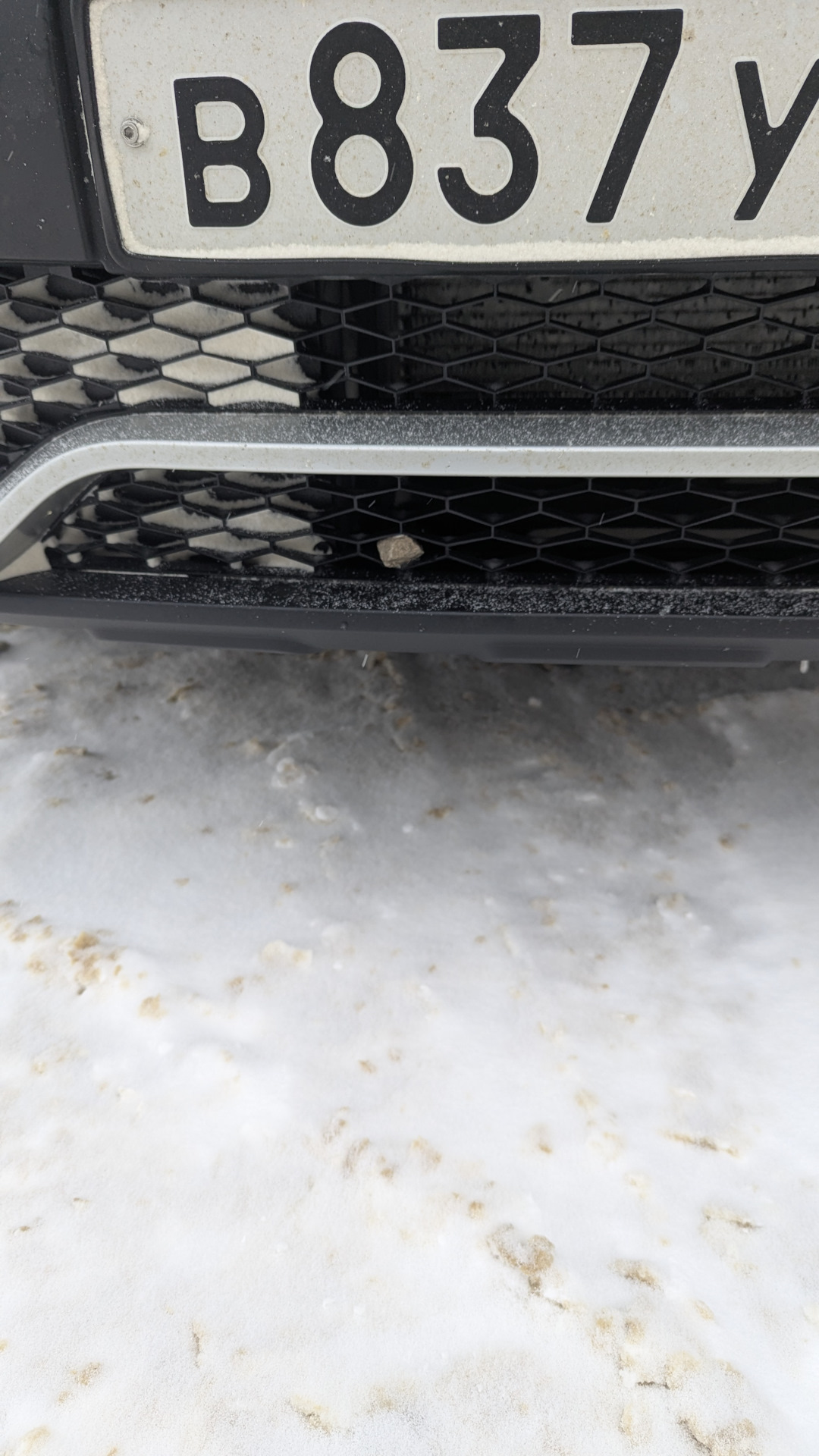 Обнаружил камень в решетке радиатора. Вытащить не получилось, засел конкретно в ячейке. Так с ним и езжу, жду тепла.
