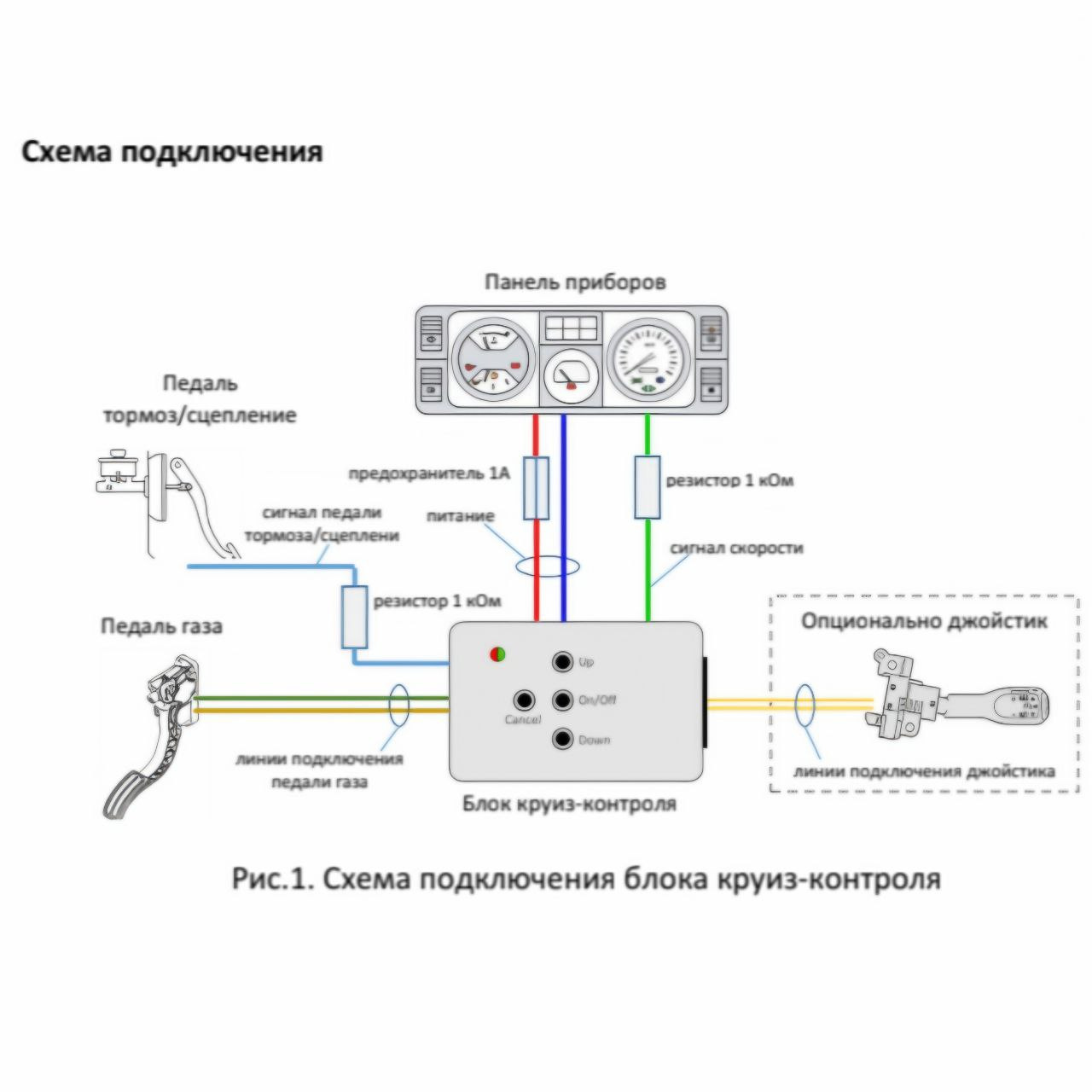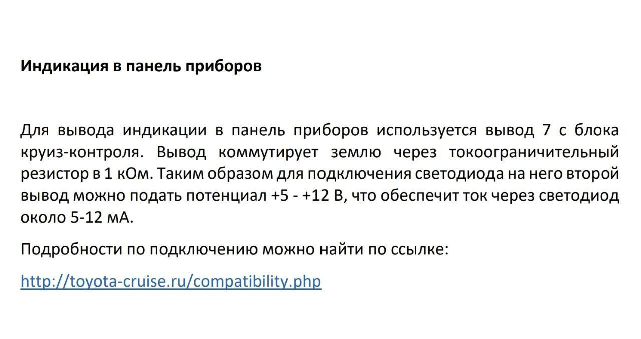 1 — Joystick1 (провод с полосой) — Улитка на рулевой 2 — Joystick2 — Улитка на рулевой 3 — V+0,8 (VPA2) — Педаль акселератора 4 — Сигнал Тормоза — очень важно обеспечить хороший контакт! 5 — V (VPA) — Педаль акселератора 6 — Сигнал Скорости — За магнитоллой 7 — Зеленый светодиод (коммутируемая земля) — не подключал, не смог разобраться, жду вашей помощи) 8 — масса/общий (равнозначен выводу 10) — Болт М6 под магнитолой на кронштейне торпеды 9 — питание +12В — от прикуривателя через отдельный пред 10 – масса/общий (равнозначен выводу 8) — Болт М6 под магнитолой на кронштейне торпеды