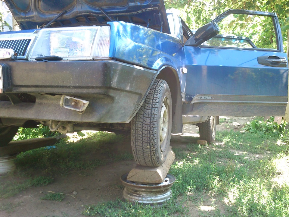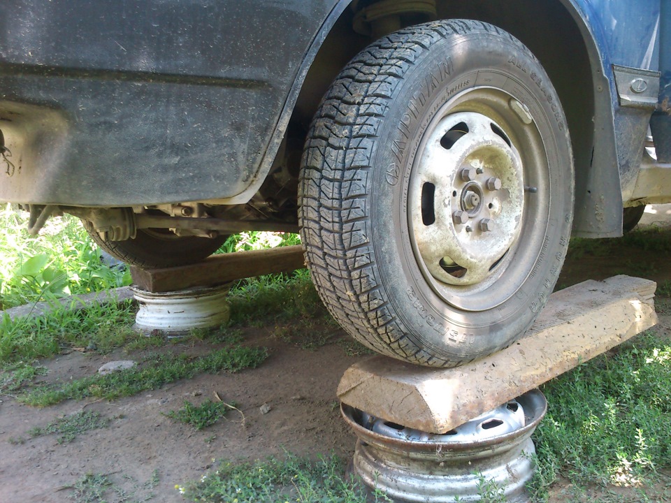 Давно у меня капало масло с поддона, все никак руки недоходили снять поддон, неудобно без ямы. Случайно нашел в огороде две доски, серьезной толщины и сразу подумал что из них можно замутить!) Еще давно лежат диски, вот они и пригодились!