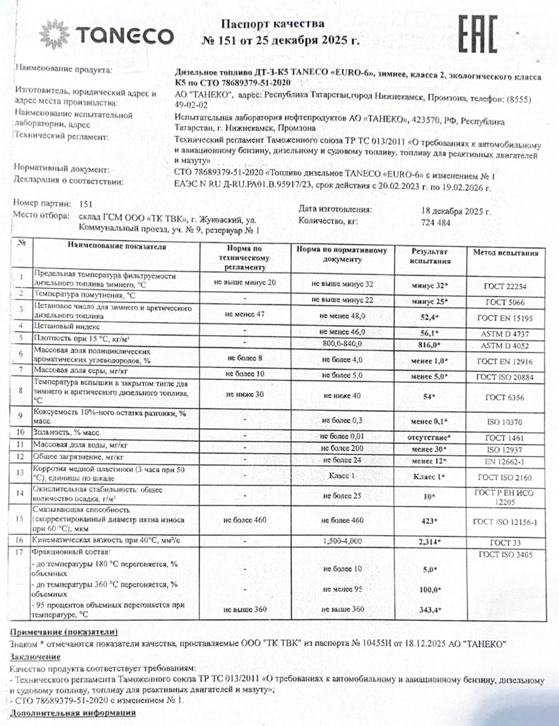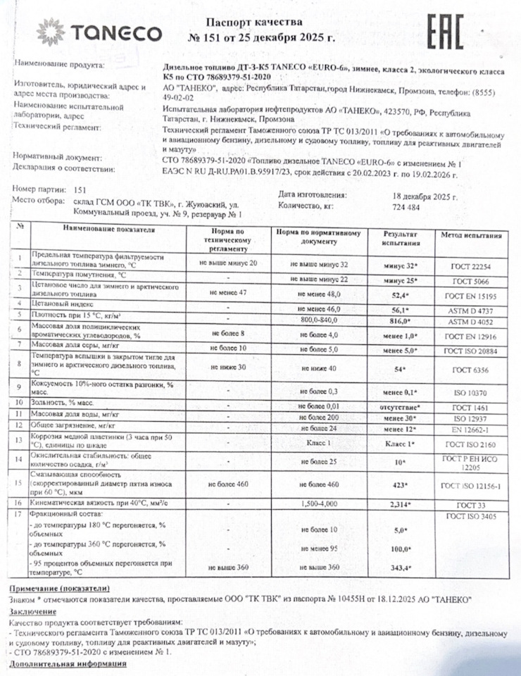 Я на дизеле езжу с 2011 года и ни разу не было проблем с зимней соляркой. Сначала был Лукойл, потом ВР, сейчас Танеко. Приложил паспорт с последней заправки — там температура замерзания -32