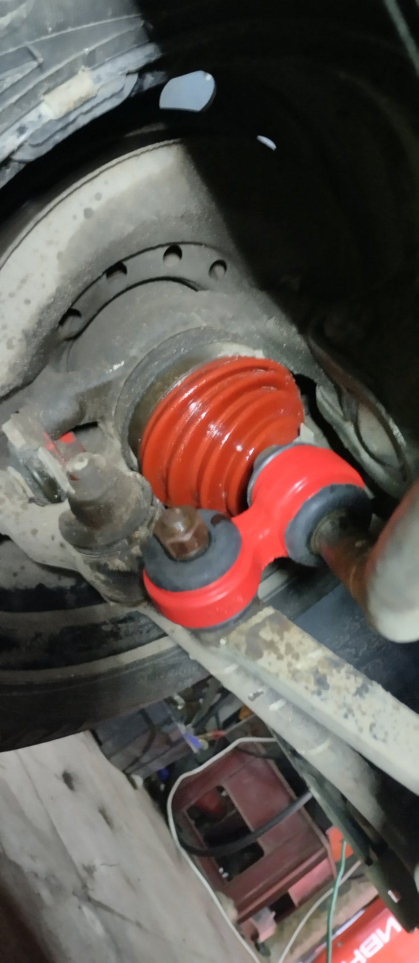 Всем добра и мира. Ещё до зимы были куплены стоики стабилизатора (простонародье яйца) и подушки стабилизатора. При этом подушки я купил с надрезом а не как обычно цельные, а то геморно их ставить на место. Стоики от фирмы а спорт, а подушки севи. За фирму севи все в курсе, запчасти от них считаю не плохими а вот а спорт я ставлю в первый раз. Теперь на счет установки, большое опасение было что обломятся шпильки на подушках, во избежание этого перед откручиванием пролил их вдшкой. За мою жизнь я их столько сломал что на готове стоял уже сварочник. Но на этот раз пронесло. При замене заметил что на штанге в местах установки образовались кратера ржавчины, по хорошему нужно было поставить от гранты но уже было поздно. Умная мысля приходит а посля. В следующий раз поставлю от гранты. Все прикрутил и заметил что шаровые опоры то же красные, пыльники тоже красные, а теперь и стоики тоже красные. Получается калина в красном. Всех благ.
